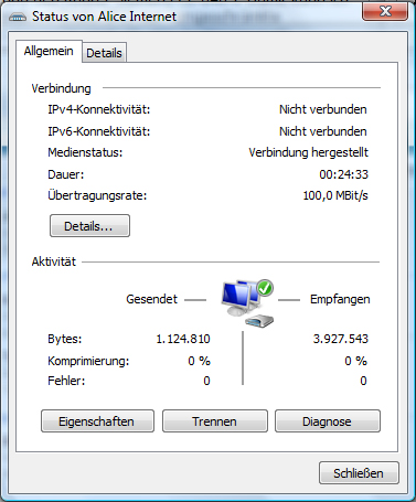 Ich habe einen Alice DSL 16k Anschluss und den Router Siemens CL-040-I. Damit kann ich zwar ins Internet, allerdings zeigt mir Windows (Vista SP2) nur "eingeschränkte Konnektivität" an. Das Netzwerk u. Freigabecenter zeigt mir eine funktionierende Verbindung an, außer die vom Router zum Internet. Klicke ich dort auf Diagnose scheinen allerdings keine Probleme erkannt zu werden. Screenshot