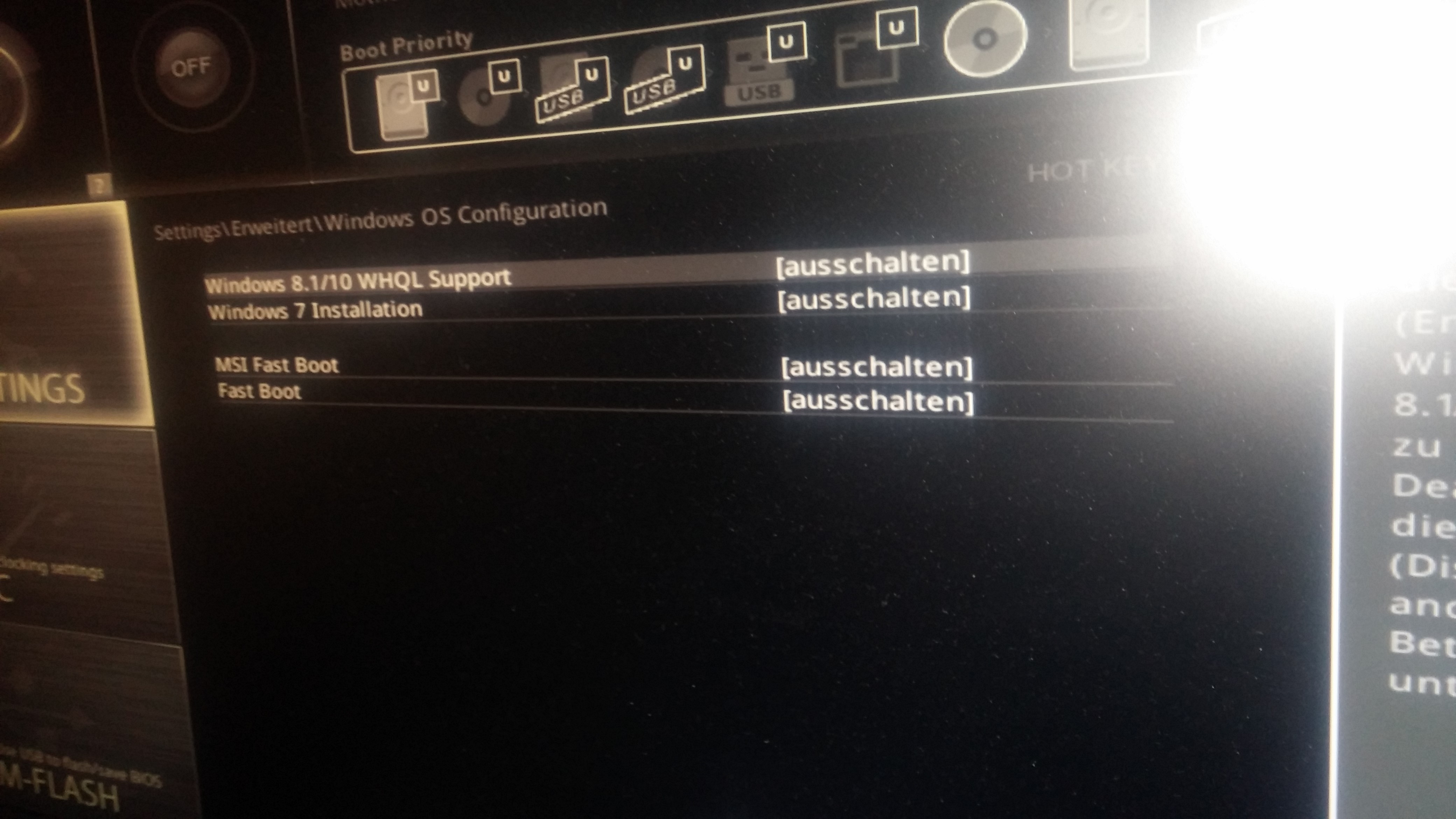 Im Bios habe ich vor der Installation die Standardwerte eingestellt. Danach habe ich unter "Windows OS Configuration" die Windows 7 Installation ausgeschaltet. Wenn es eingeschaltet ist zeigt sich ne Fehlermeldung im Geräte Manager.