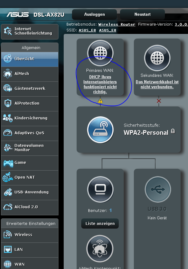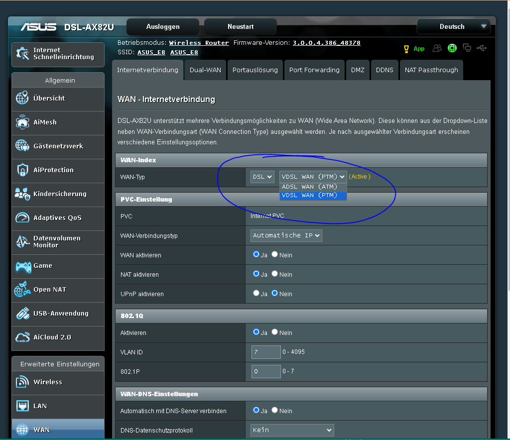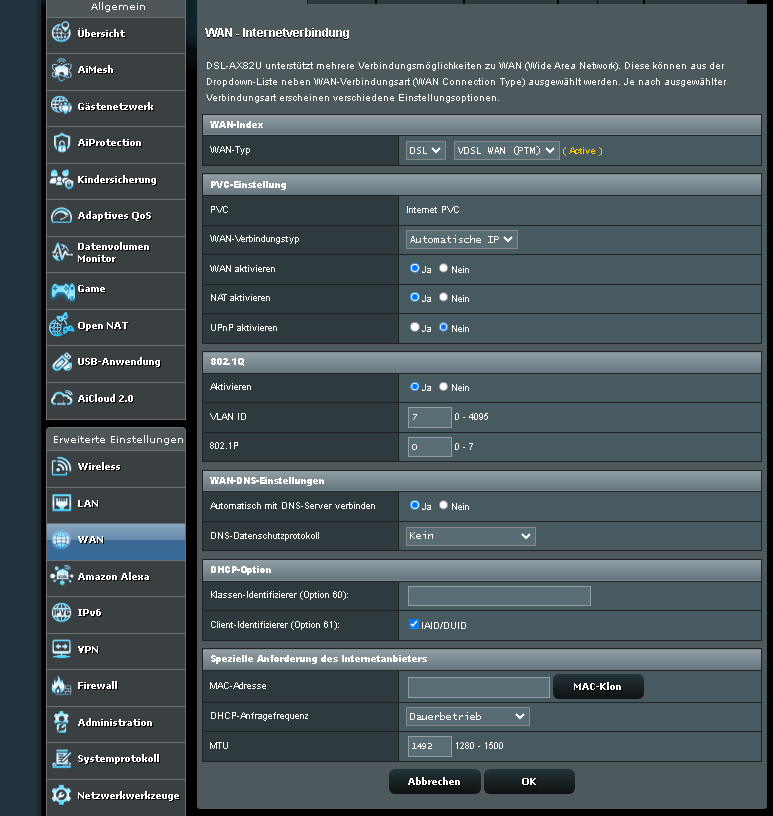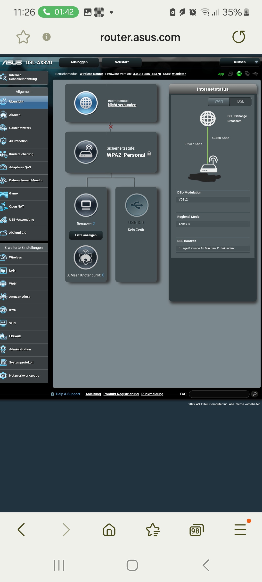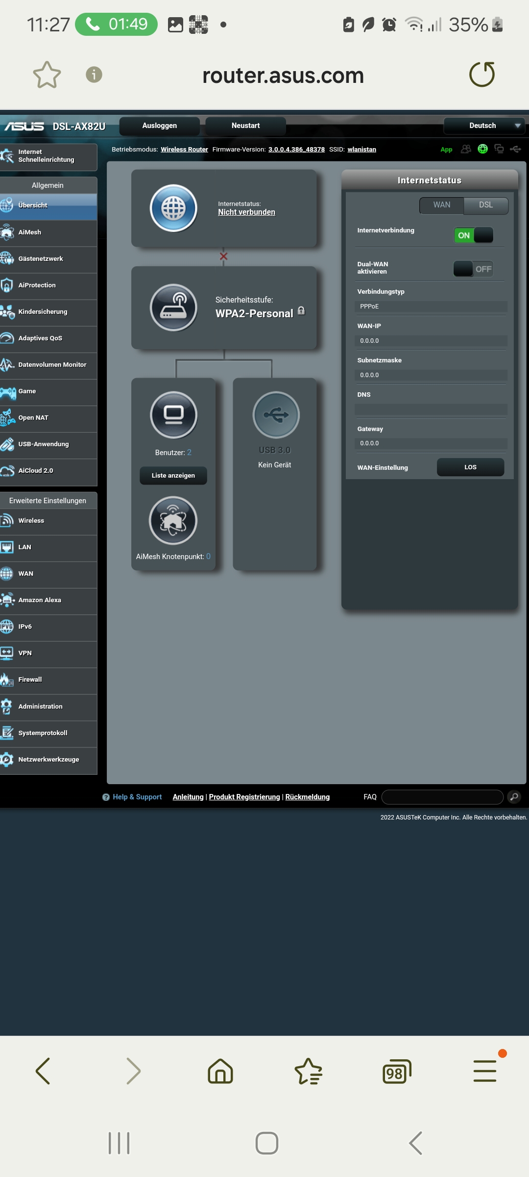 Ich will den Asus DSL-AX82U VDSL Modem Router einrichten(via. RJ11 auf TAEF Kabel), leider kann dieser Router nach selbständiger Einrichtung keine Verbindung aufbauen.
