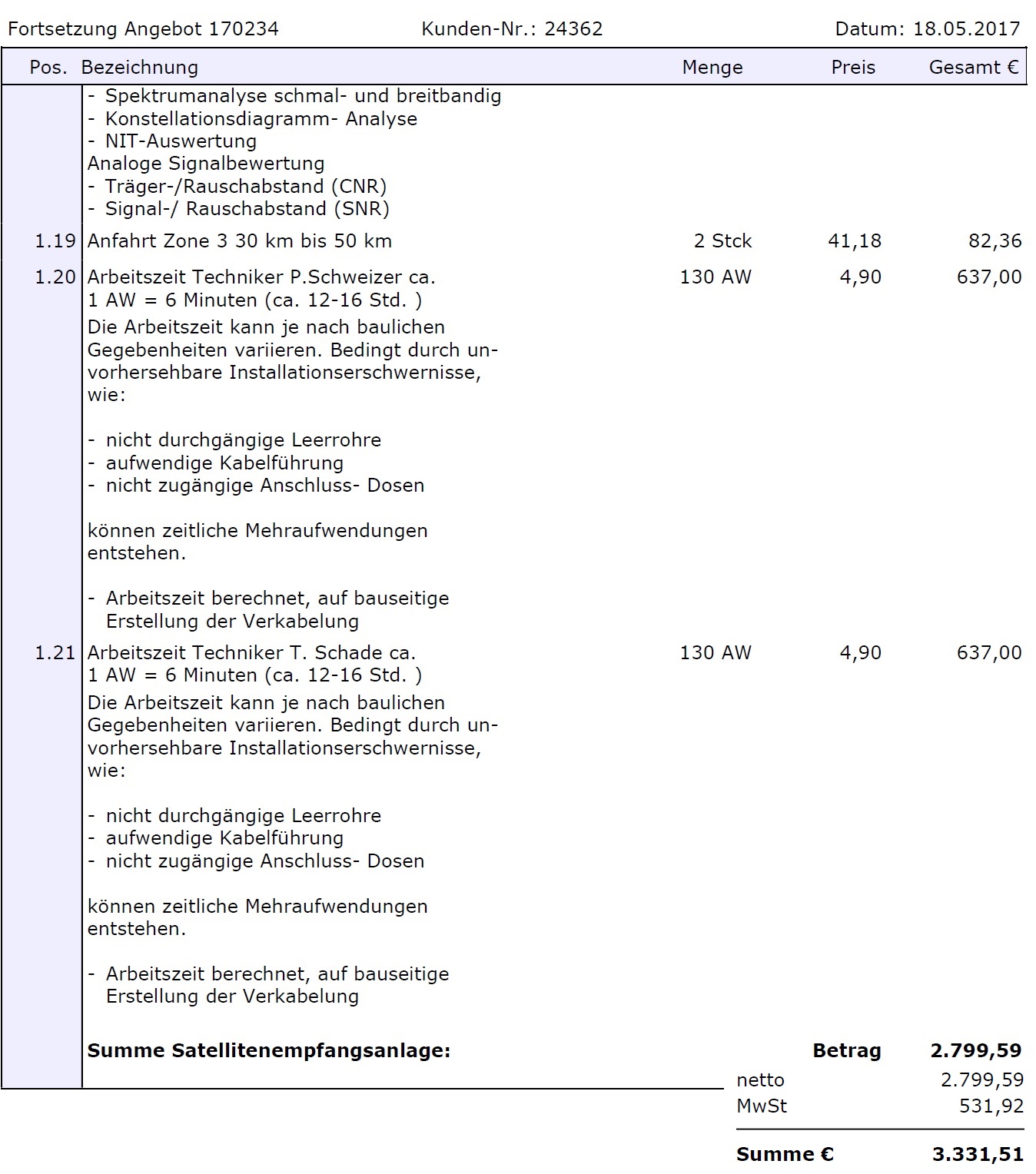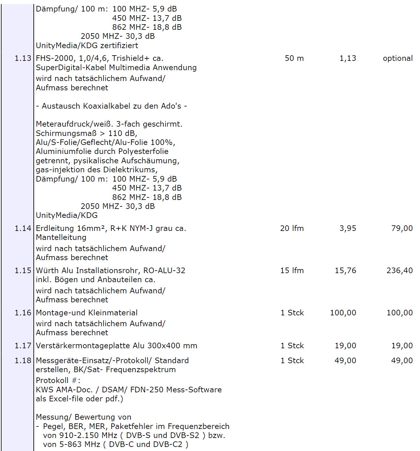 Jetzt hatten wir eine Firma gefunden, die sich auf SAT-Installationen spezialisiert und auch ein gutes Ranking hat, aber der Kostenvoranschlag hat uns ziemlich umgehauen. Ich würde euch hier jetzt mal die Auflistung reinschreiben, damit ihr euch mal ein Bild machen könnt, denn ich habe überhaupt keine Ahnung, ob das gängige Normalpreise für eine Sat-Installation sind, oder ob das einfach nur hoffnungslos überteuert ist: