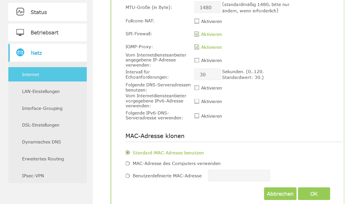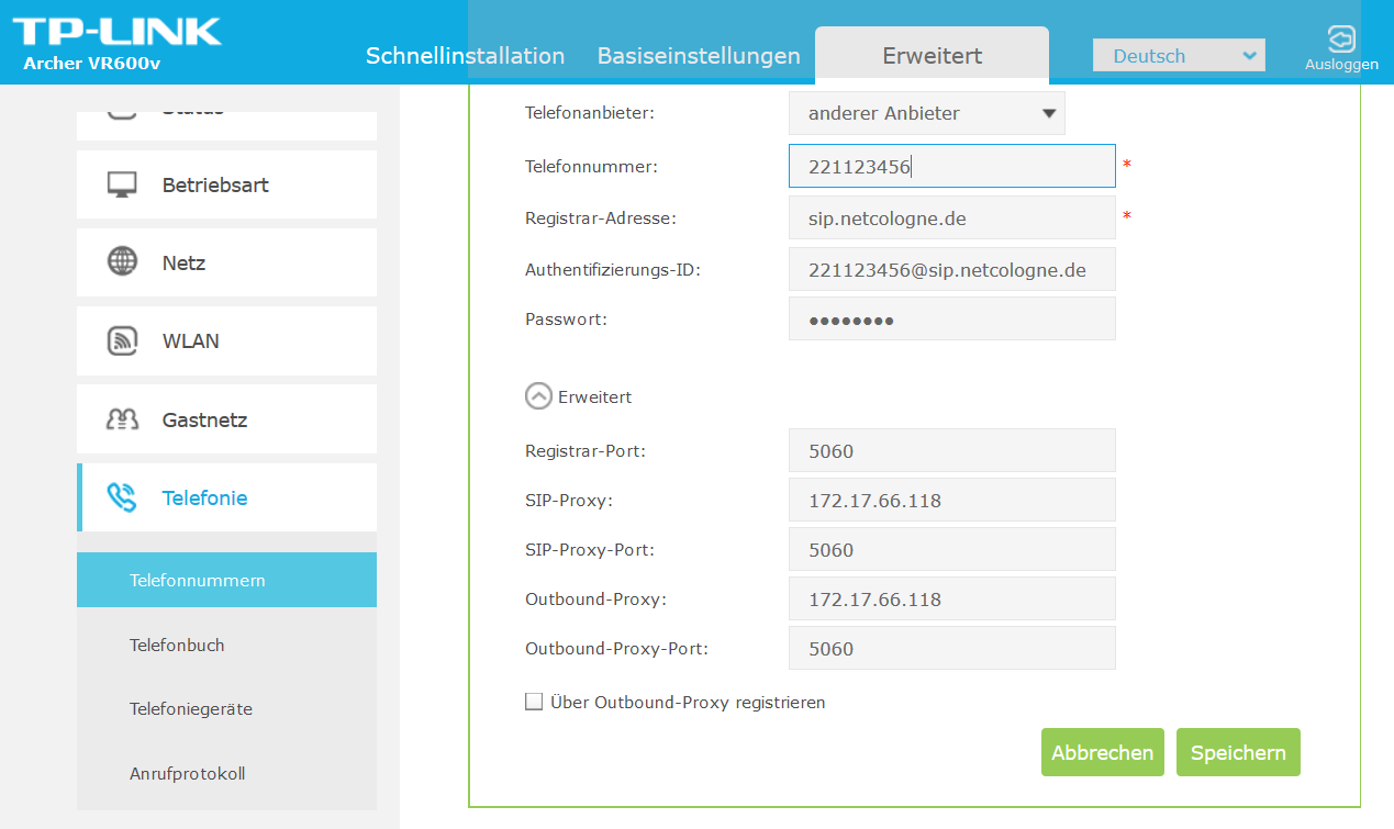 Das ganze habe ich nach Rücksprache mit Netcologne und TP-Link Hotlines im Router eingetragen und auch die erweiterten Einstellungen angepasst: