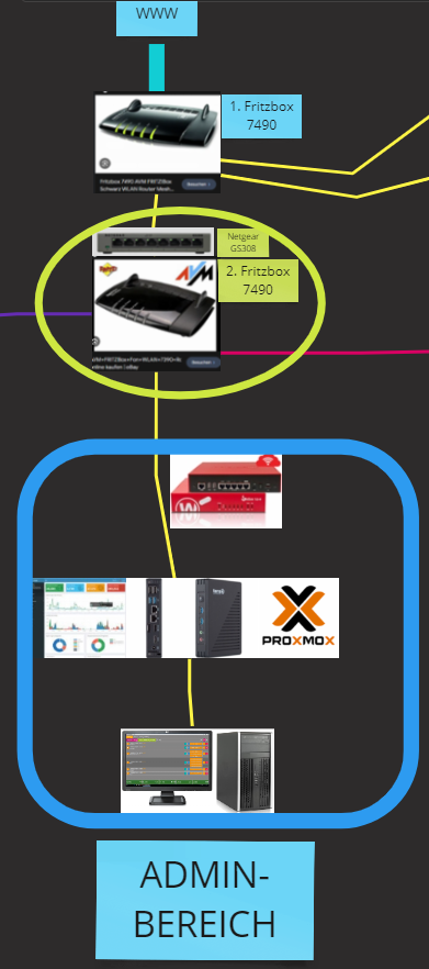 1.1 Ich möchte keine indirekte "Schleife" sprich, das der Admin-PC auf LANbuchse 2 geht, dann DNS Pi-Hole auf LANBuchse 3 und dann von dort aus zurück über die Fritzbox 2 auf Fritzbox 1 dann ins Internet usw...