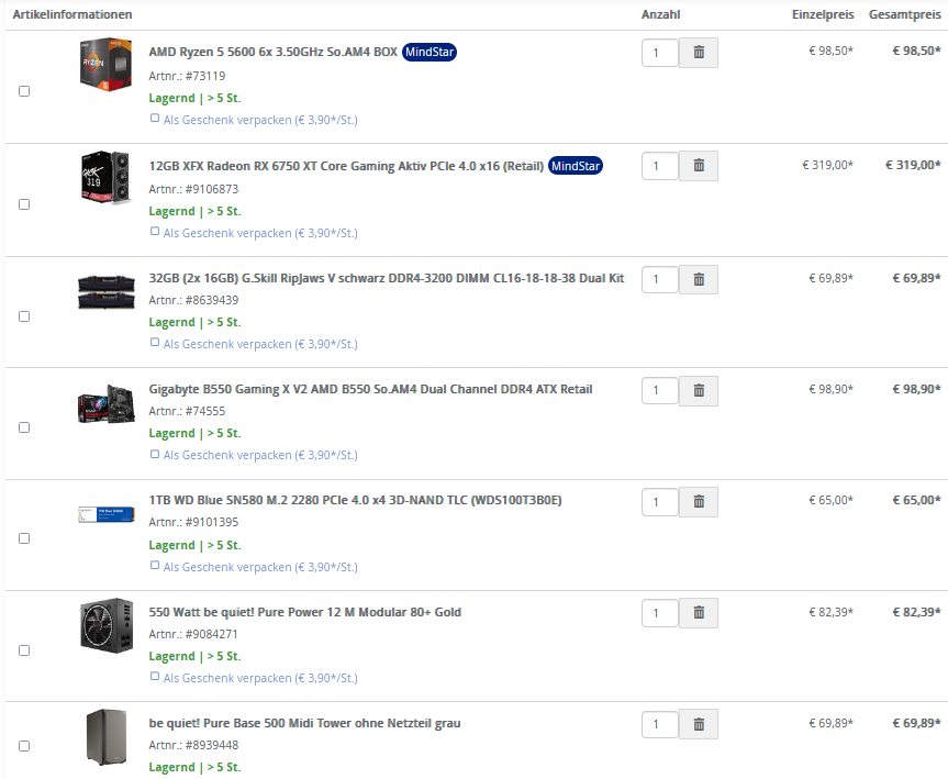 An dieser Stelle würde ich etwas konfigurieren und eine RX 7700 XT sowie ein be quiet! Pure Power 12M 650W Netzteil hinzufügen komme somit auf 1233,80€(+Windows). Oder habt ihr andere Tips, die oben genannten Erwartungen eher entsprechen?