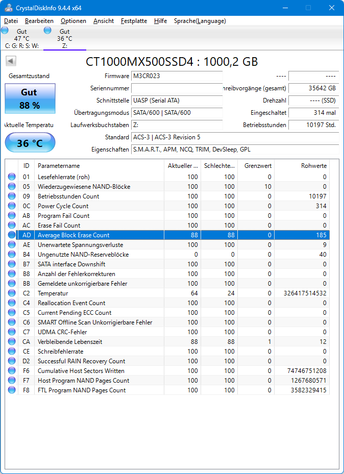 Nun möchte ich die beiden SSDs jedoch anders nutzen und habe mir mittels CrystalDiskInfo die SMART-Werte ausgelesen. Da ich diese jedoch nicht wirklich interpretieren kann, möchte ich euch um eure Expertise bitten.