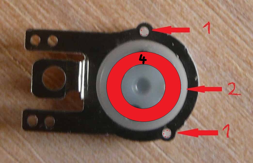 Warum verdreht sich aber der Druckknopf? Die beiden kleinen winzigen Stifte (1), die das Verdrehen des Knopfes verhindern sollen, sind so dünn, dass sie über kurz oder lang unweigerlich abbrechen.