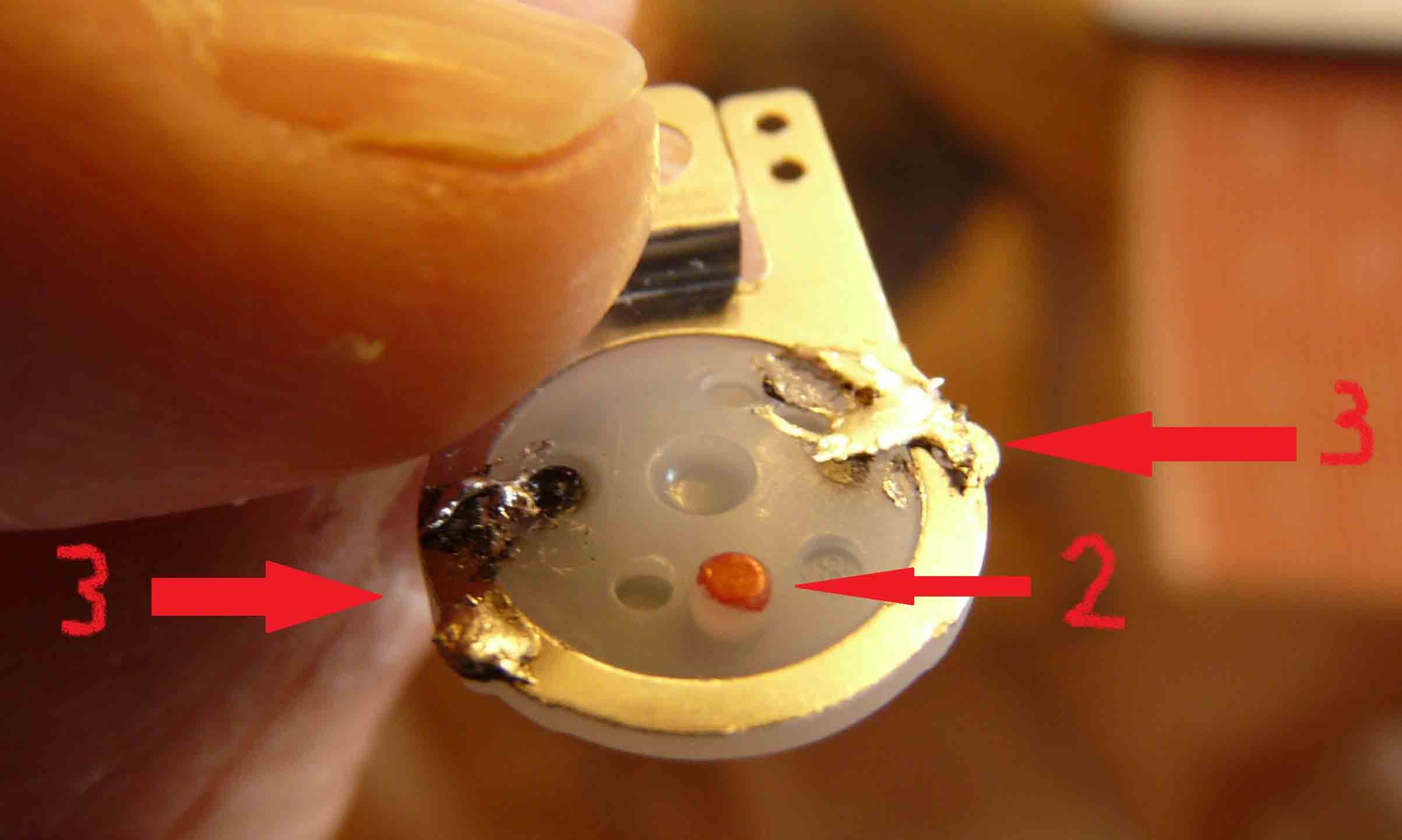 Das Photo (3) zeigt den ersten dilletantischen Versuch mit Lötzinn. Das ist wieder abgefallen, aber mit Kunststoff hat es funktioniert. Ich habe leider kein Bild hierzu.
