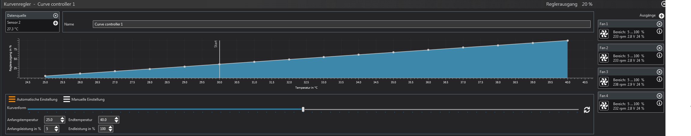 Da ich die Geräuschkulisse bei wenig Last (z.Bsp. Home Office) möglichst klein haben will, hab ich die Lüfterregelung mal so konfiguriert:
