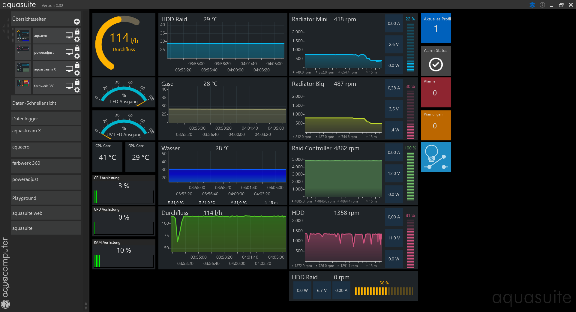 Nachdem ich nach einem Crash meine Aquasuite neu einrichten musste, hab ich die gerade auf die neuste Version gehoben und nachdem ich rausgefunden hab, wieso die Lüfter nicht mehr wollten (Aquaero hatte ein Stromunterbruch, obwohl kein Stecker gezogen wurde) möcht ich mal fragen, ob es bei meinen Einstellungen Optimierungspotenzial gibt.