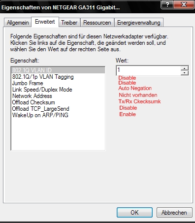 Hallo, ich habe die Netzwerkarte GA311 von Netgear im Rechner. Jetzt hab ich gehört man sollte an dieser diverse Einstellungen vornehmen. Kann mir vielleicht anhand des Bildes die richtigen verraten?