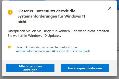Wenn ich aber die PC Integritätsprüfung laufen lasse, oder WhyNotWin11 wird mir folgendes angezeigt: