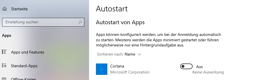 Cortana schläft seit der Windows 10 2004, wird auch automatisch im Autostart deaktivert,