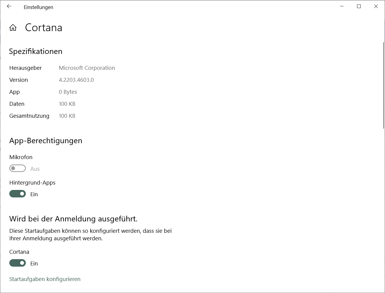 Alle Apps, Cortana, (rechtsklick) Mehr, App Einstellungen.