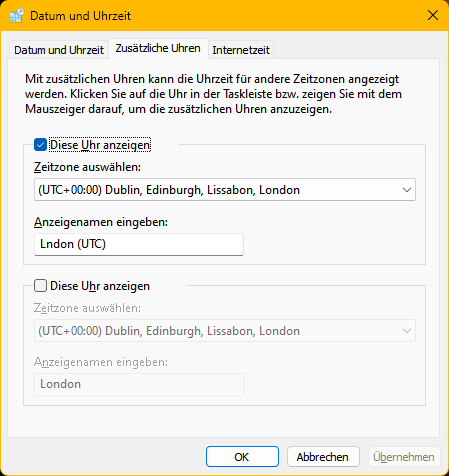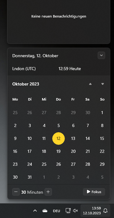 ich habe letzte Woche meinen PC von Windows 10 auf Windows 11 umgestelt. Alles läuft reibungslos. Was mich ein wenig verwundert ist der Eintrag "London (UTC) hh:mm Heute" im aufgeklappten Kalender der Taskleiste (siehe Screenshot).