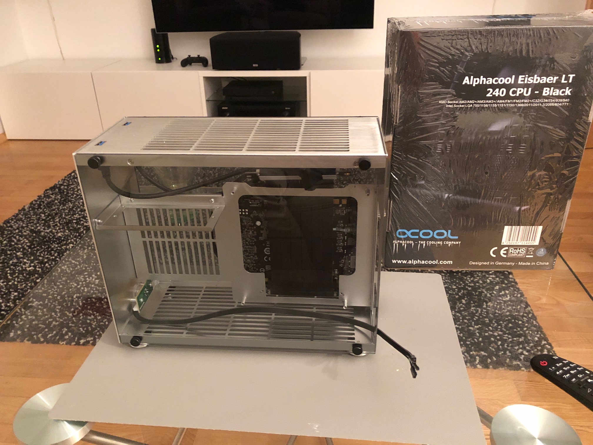 habe mir letzte Woche aus Shenzhen ein kleines ITX Gehäuse (9l Dan A4 Klon aus Alu mit hübschen Glaspanelen und Platz für nen 240mm Radiator) mitgenommen. Folgende Hardware soll verwendet werden: