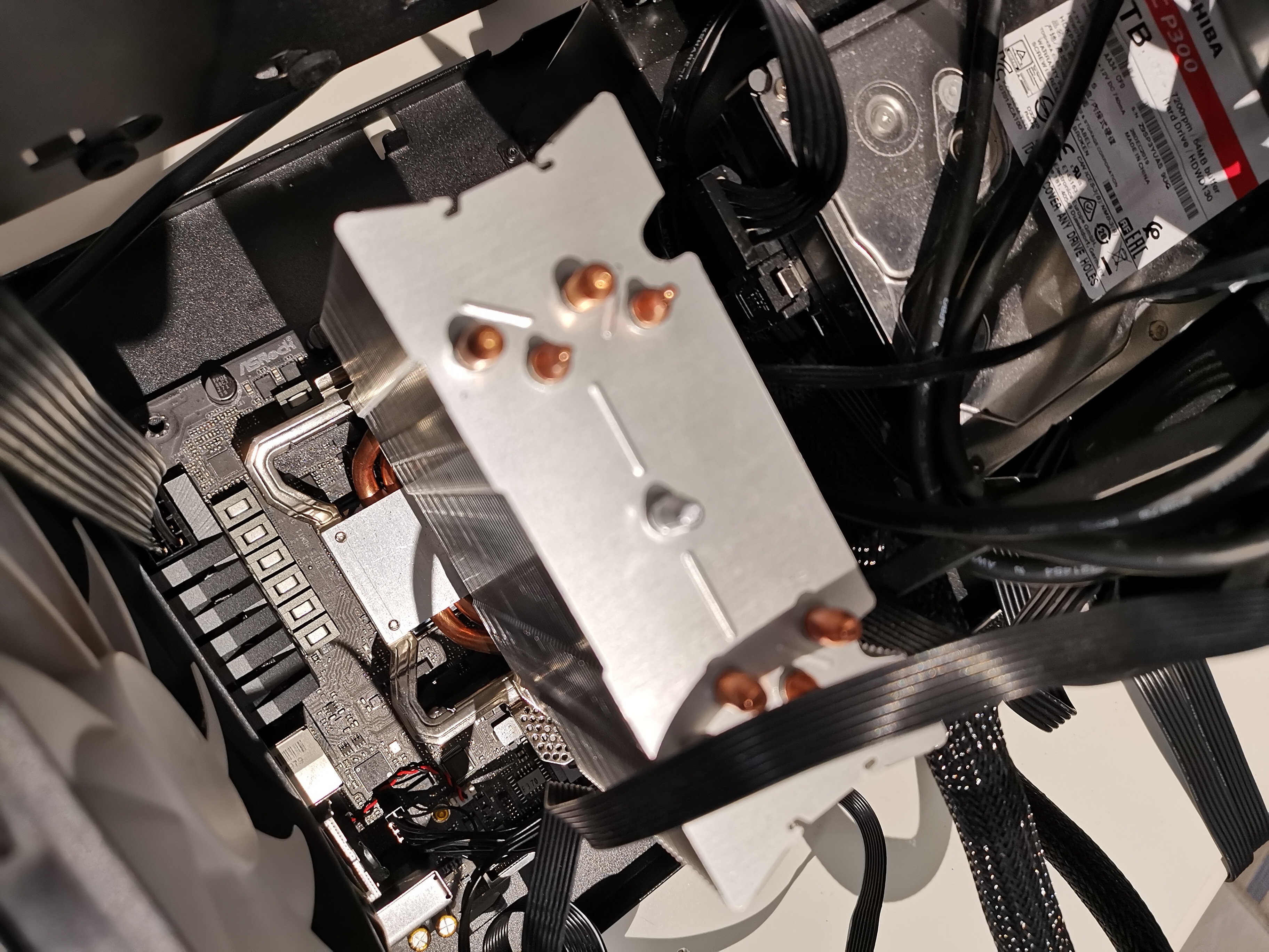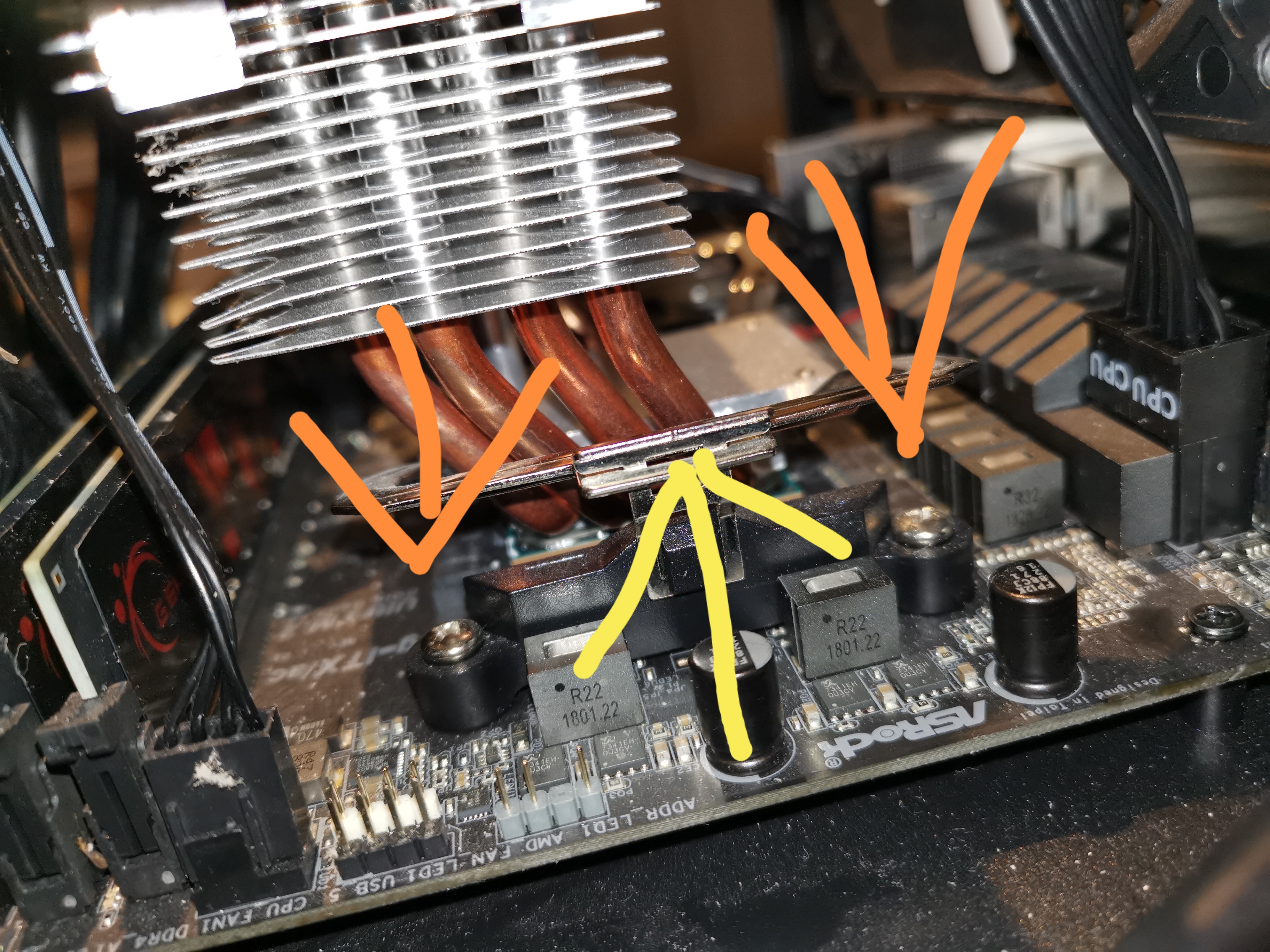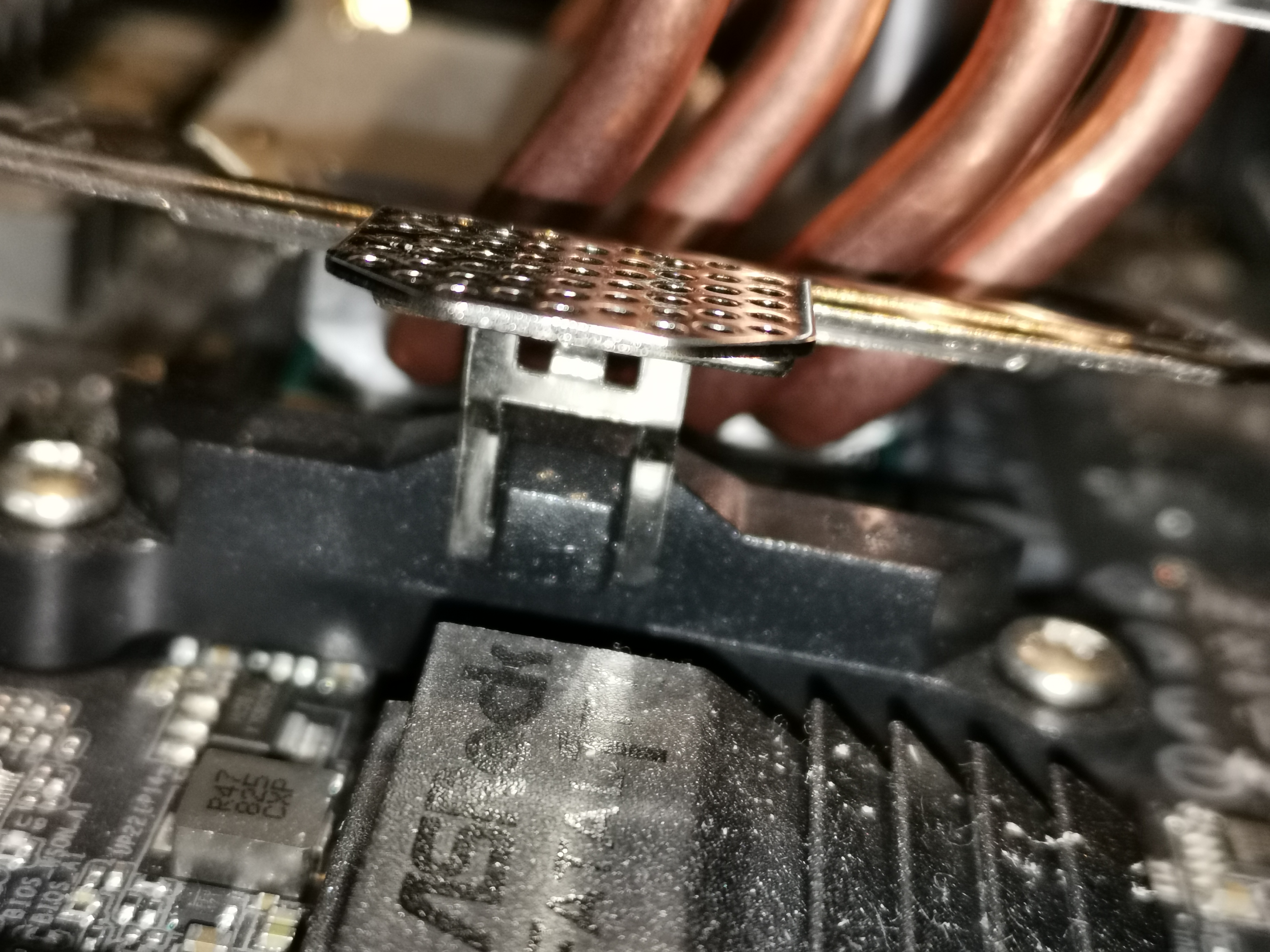 Ich würde es nochmal mit Drücken auf das Seitenstück probieren mit dosierter Kraft und dann im gedrückten Zustand zum Kühler hin führen, damit die Klammer unter dem Seitenstück unten vom Kühler weg aus der Halterung geht. Dann könnte der Kühler entnehmbar sein und Du kämst dann an die Schrauben, ist eine Vermutung.