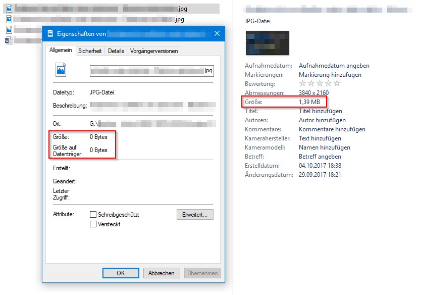 Ich lasse die Details der Datei auf der rechten Seite des Explorers anzeigen. Dort zeigt die Datei eine Größe von 1,39 MByte an. Wenn ich allerdings die Eigenschaften der Datei öffne, wird mir dort eine Größe von 0 Byte angezeigt.