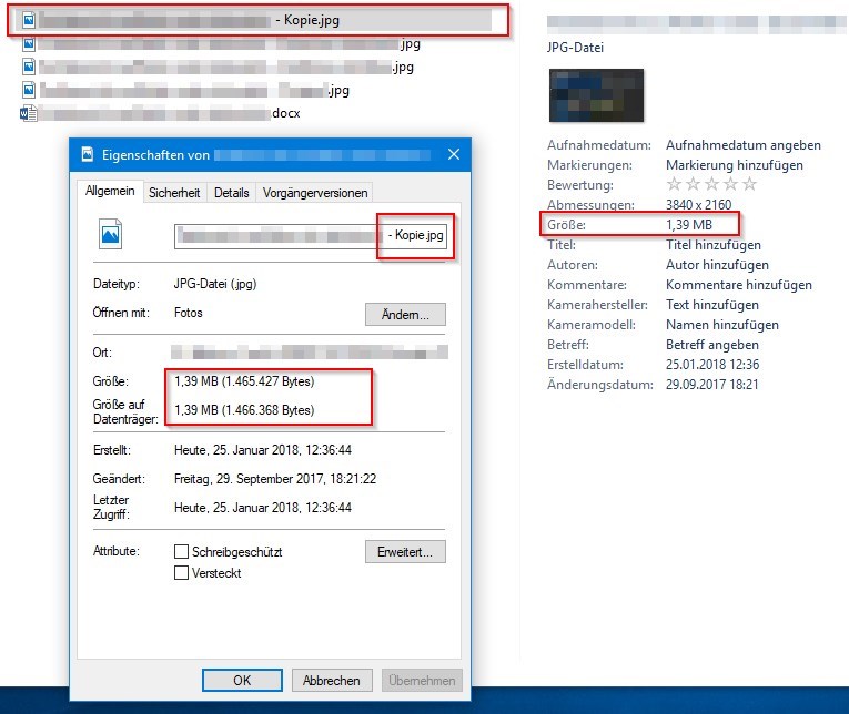 Wenn ich die Datei manuell auswähle und auf meine Zielfestplatte kopiere, so funktioniert das einwandfrei. Ich kann die Datei sogar innerhalb des Ordners der externen Festplatte "kopieren" bzw. duplizieren; mit dem gewohntem "- Kopie" als Anhang. Auch diese Datei kann einwandfrei geöffnet werden. Die auf diese Weise "duplizierte" Datei hat in diesem Ordner dann sogar eine korrekte Größe von 1,39 MByte - sowohl bei der Anzeige der Details auf der rechten Seite des Explorers als auch in den Eigenschaften der Datei.