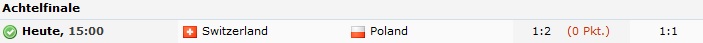 beim 15uhr spiel 1:2 getippt für polen. wertung war aber das 1:1 nach 90min. nach elfmeterschießen hat polen gewonnen. somit hätte ich ja 2 punkte statt 0 bekommen müssen...