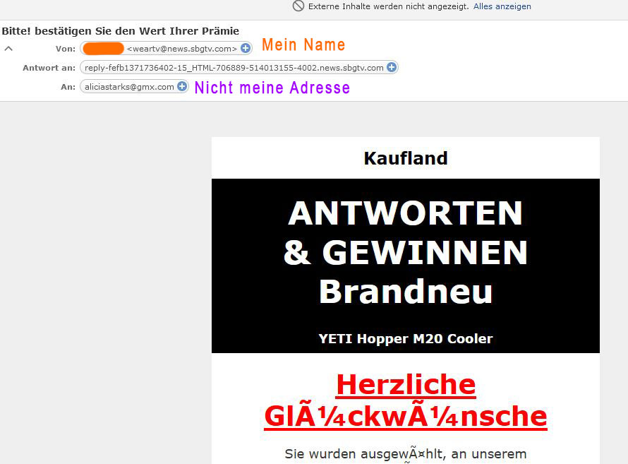 Als Empfänger Adresse steht dort aber nicht meine Adressse, sondern eine Adresse die ich nicht kenne.