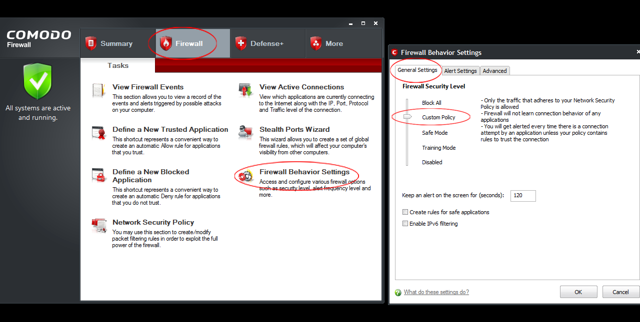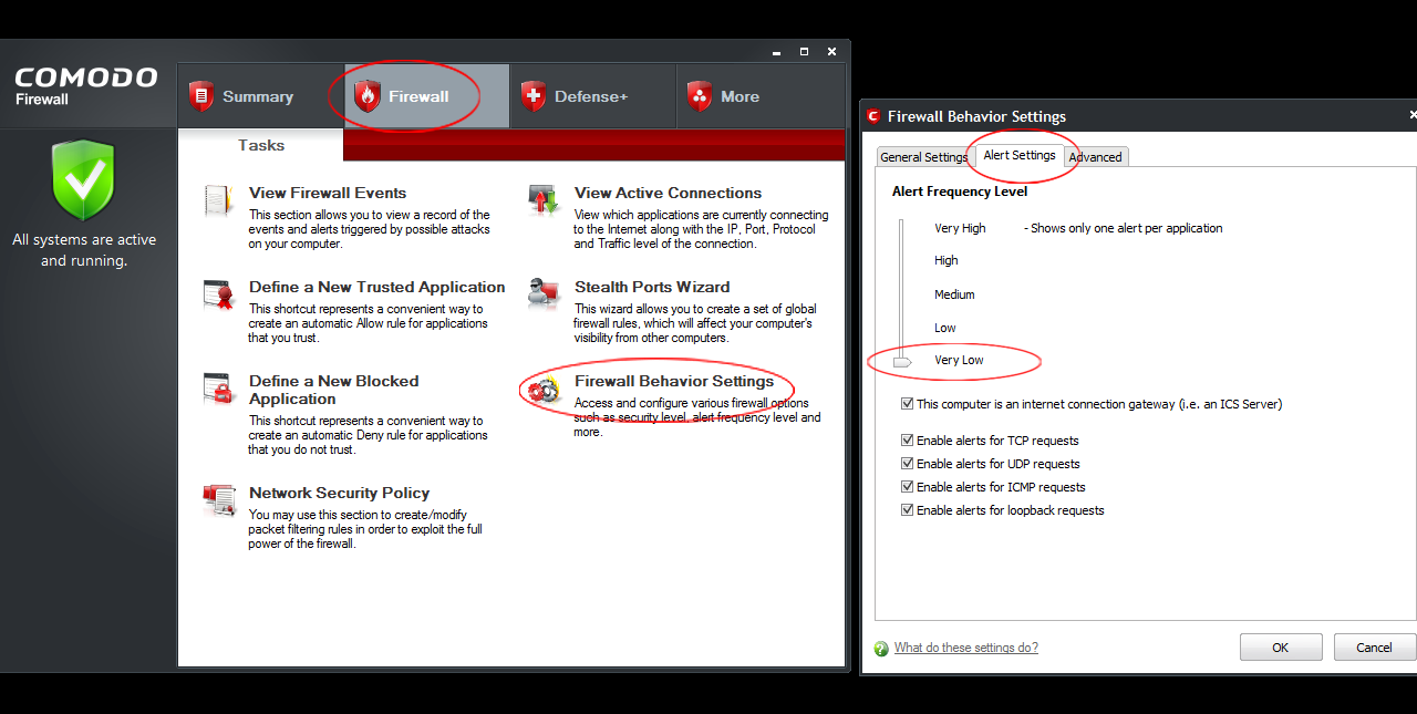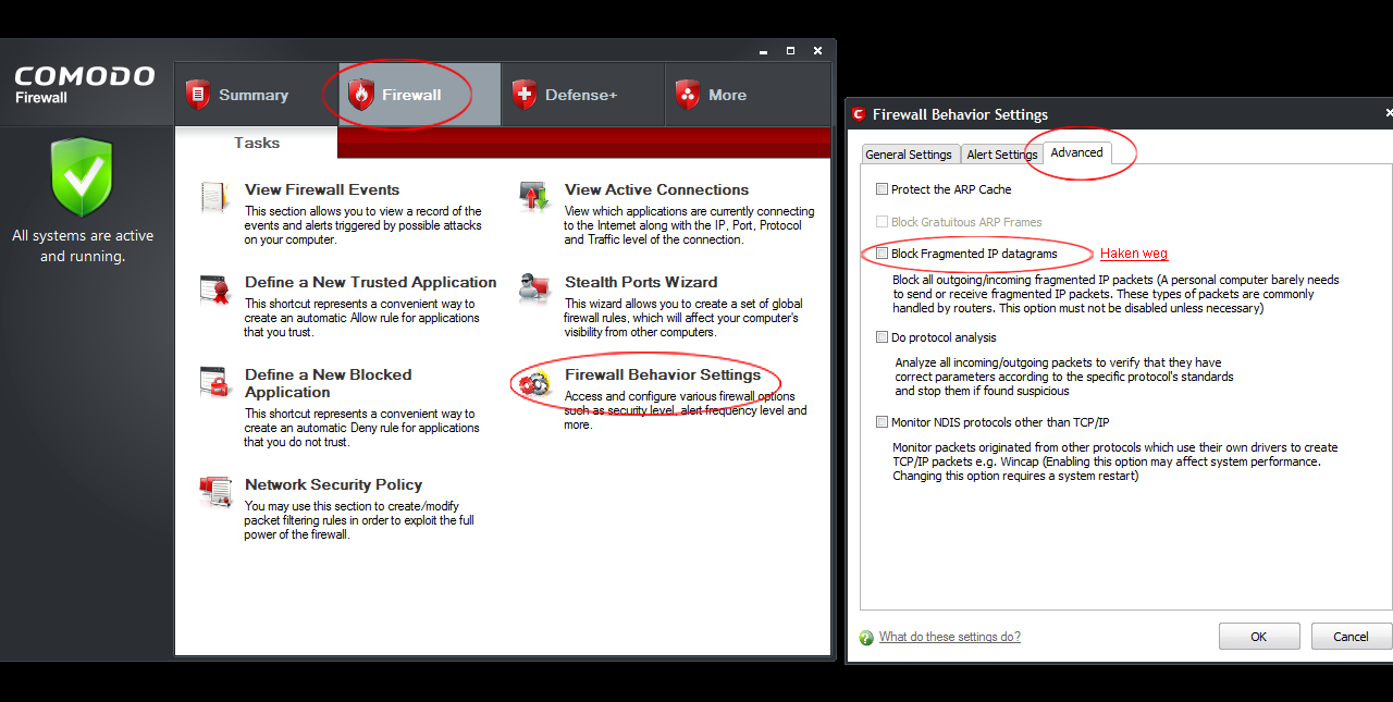 (ZoneAlarm hat beispielsweise in gewissen x64-System-Konfigurationen DPC-Latenzprobleme verursacht, die nach Umstieg auf (damals) Outpost sofort und rekonstruierbar verschwunden sind. Auch bei Comodo habe ich solche Probleme nie gehabt.) Die Windows-eigene Firewall habe ich vollständig deaktiviert.
