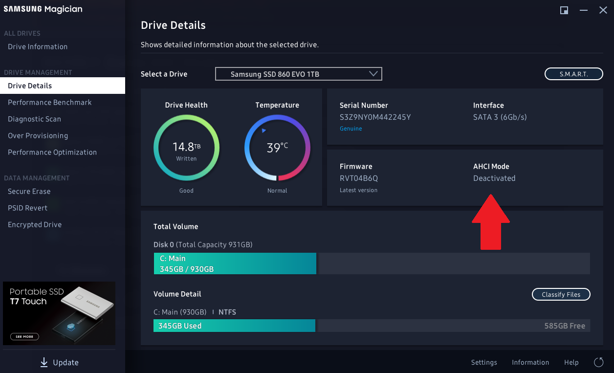 Dabei ist mir aufgefallen, dasss AHCI für keine meiner drei SSD/HDD aktiviert ist (laut Samsung Magician) ... im BIOS ist AHCI allerdings aktiv, die einzige andere Option dort wäre RAID.