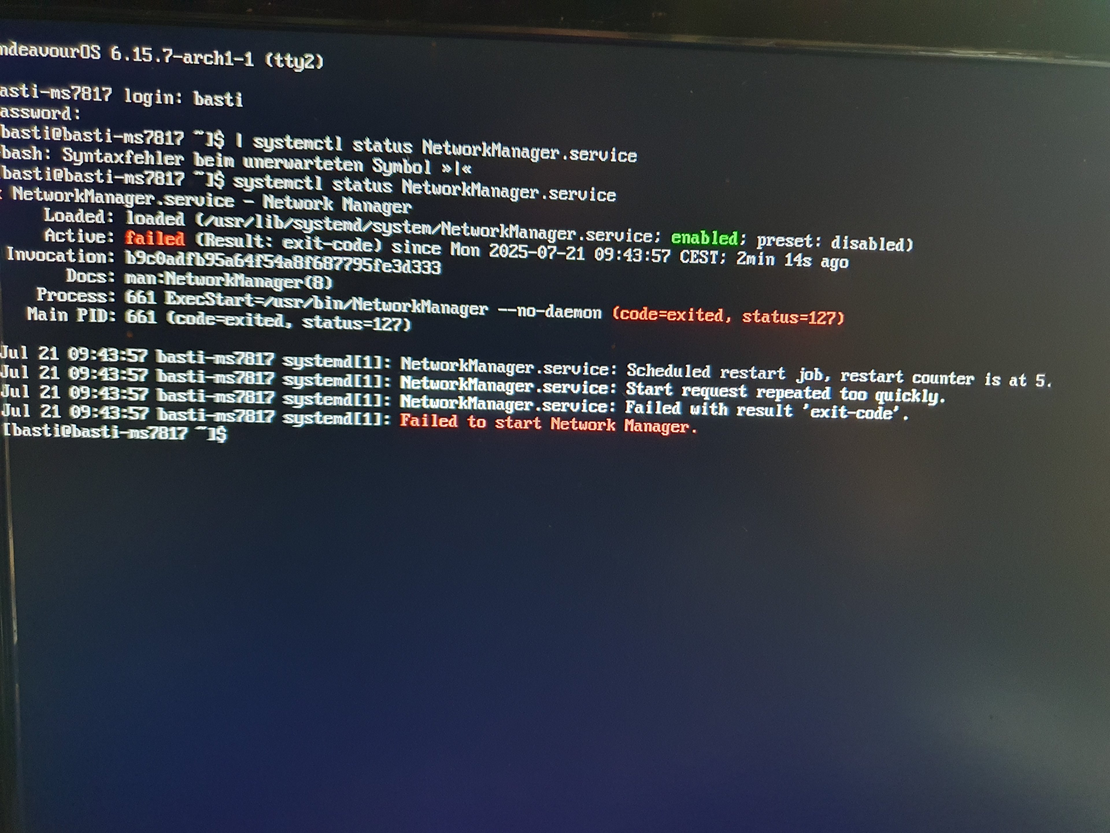 Vor dem Update hatte ich schon paar mal ein schwarzen Bidschierm beim hochfahren, vorher hat es immer geklappt Nach dem das mit den Terminal war, habe ich ein die Reboot taste gedrückt, jetzt kommt nur noch 2 mal Failed to start Network Manager (see ' systemctl status NetworkManager.service' for details) und bleibt dann beim letzten stehen, was kann ich da machen?