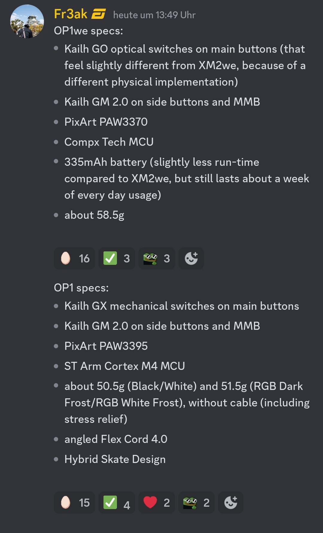 Im Endgame-Discord hatte ich vor ein paar Monaten mal darauf hingewiesen, dass andere Firmen es ja längst geschafft hätten, ihre kabellosen Mausvarianten mit dieser Sensor- und Tastergeneration auf den Markt zu bringen. Reaktion war eine schnippische Antwort, dass alle anderen Anbieter ja keine Custom-Komponenten verwenden, wie es Endgame Gear täte.