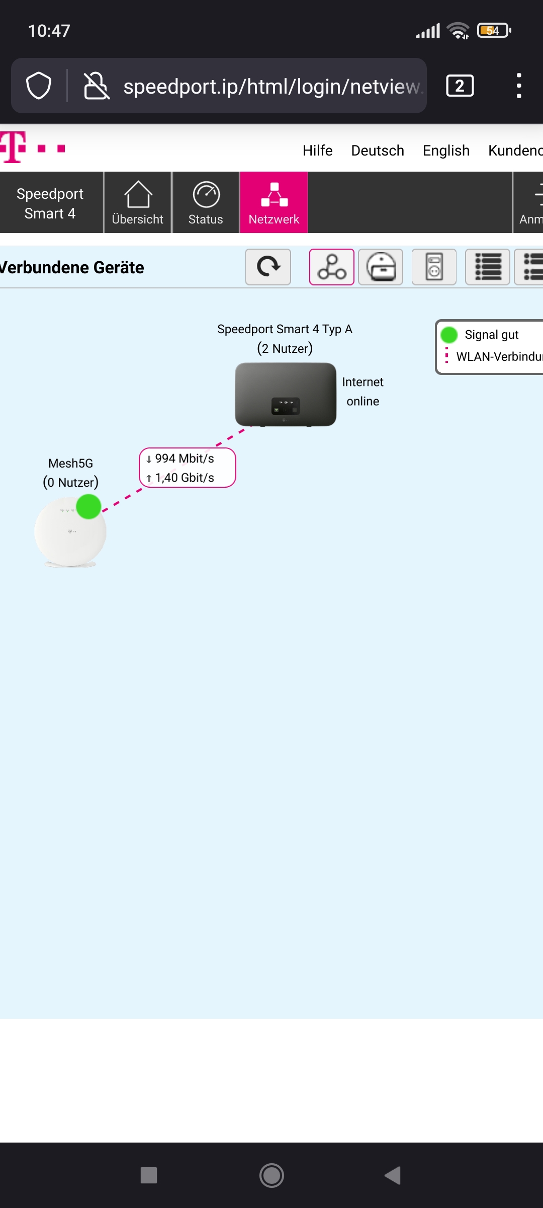 Um die Strecke von 3,5m + Wand zu "verkürzen" habe ich im Hausgang (genau luftlinie zwischen Router und Büro) einen "Mesh-Repeater" von der Telekom geholt, das Dingens heisst Speed Home WiFi und auch gestern schon per WPS mit dem Router verbunden. Ich erhoffe mir damit, dass ich im Büro auf 3-4 WLAN-Balken zu kommen und somit auch etwas mehr Mbit Leistung für Video-Meetings zu bekommen.
