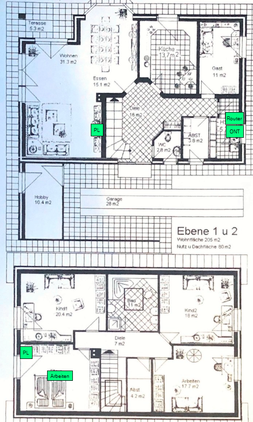 Gleicher Fall gilt fürs Arbeitszimmer im OG, hier soll mein privater PC per Kabel verbunden werden. Arbeitsrechner hat nur WLAN, reicht also ebenfalls ein Verstärker im PL-Adapter.
