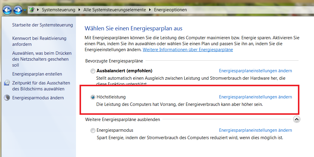 hab Win7 Ultimate (selber installiert) würde nun gerne die Energieeinstellungen auf Höchstleistung ändern, nur leider ist der "Übernehmen" Button auf der Energieoptionen-Erweiterte Einstellungen-Seite immer ausgegraut so das er immer wieder auf Ausbalanciert zurückspringt wenn ich nach der Umstellung auf OK klicke. Habe auch Kennwortabfrage bei Reaktivierung auf "Nein" gestellt...