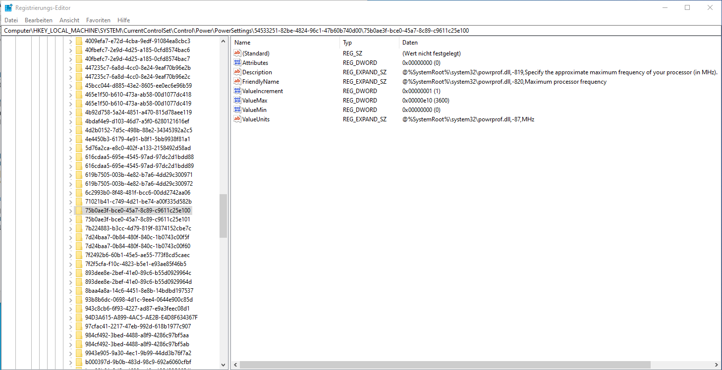 Ich habe bereits versucht über die Registry (HKEY_LOCAL_MACHINE\SYSTEM\CurrentControlSet\Control\Power\PowerSettings) die weiteren Energieoptionen "freizuschalten" und in den einzelnen Unterpunkten den jeweiligen "Attributes" Wert auf "0" gesetzt, leider ändert auch das absolut gar nichts.