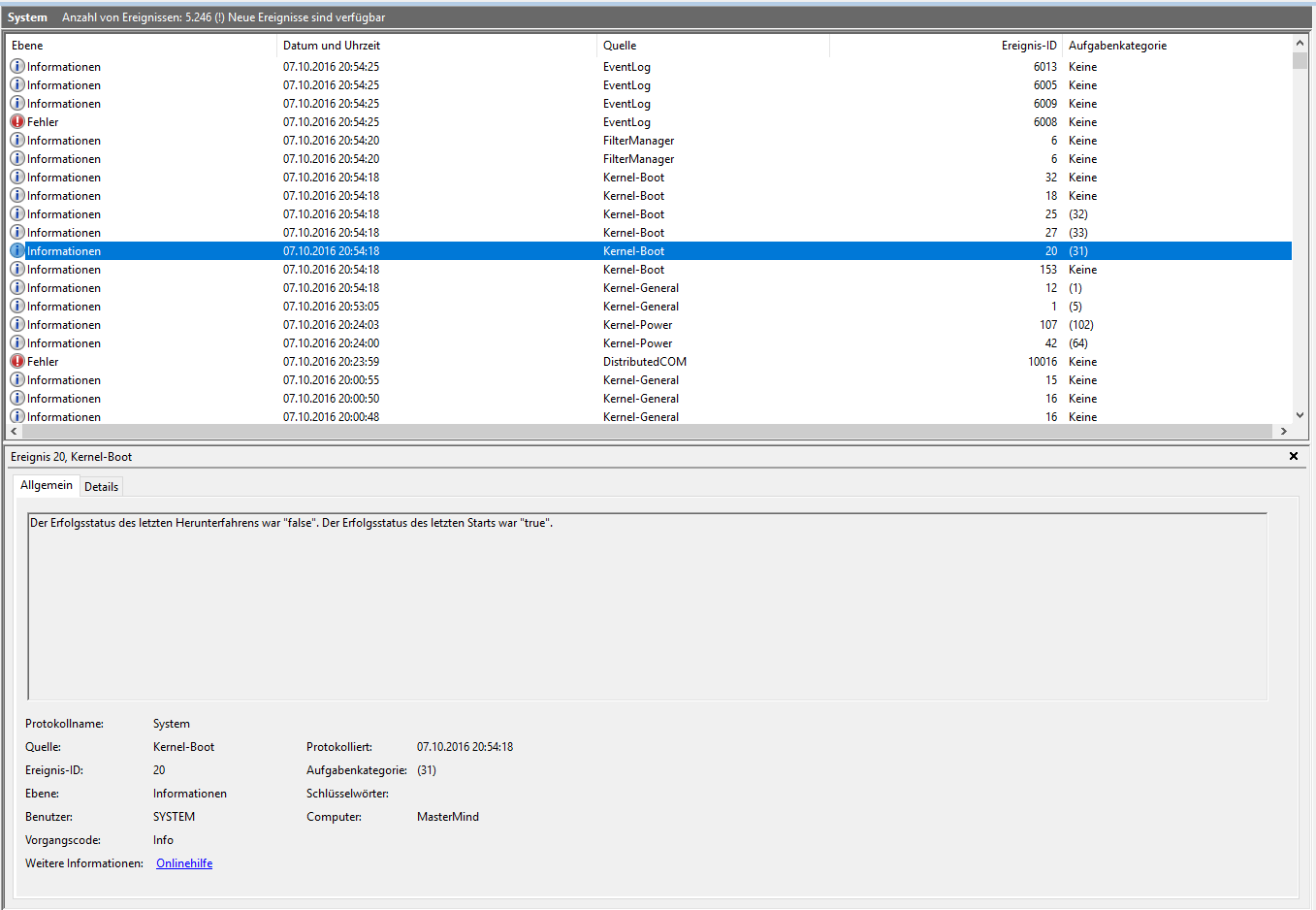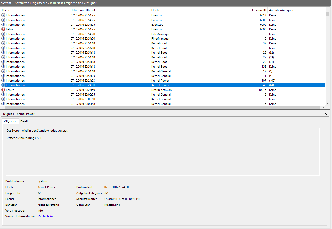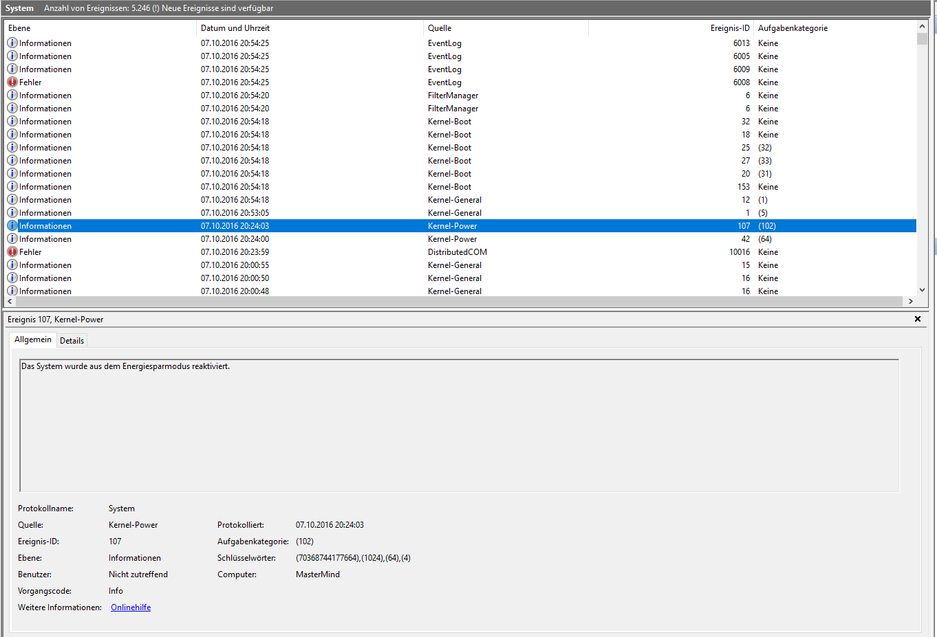 Ich habe in der Ereignisanzeige nachgesehen was passiert, sobald ich den Energiesparmodus aktiviere. Im Anhang sind drei Screens. Um 20:24:00 habe ich auf "Energie sparen" geklickt, was auf dem ersten Screen ersichtlich wird. Allerdings erscheint schon um 20:24:03 die Meldung: "Das System wurde aus dem Energiesparmodus reaktiviert." obwohl ich letzteres erst um 20:53:05 getan habe (Screen2). Gibt es noch weitere Möglichkeiten das ganze zu analysieren?