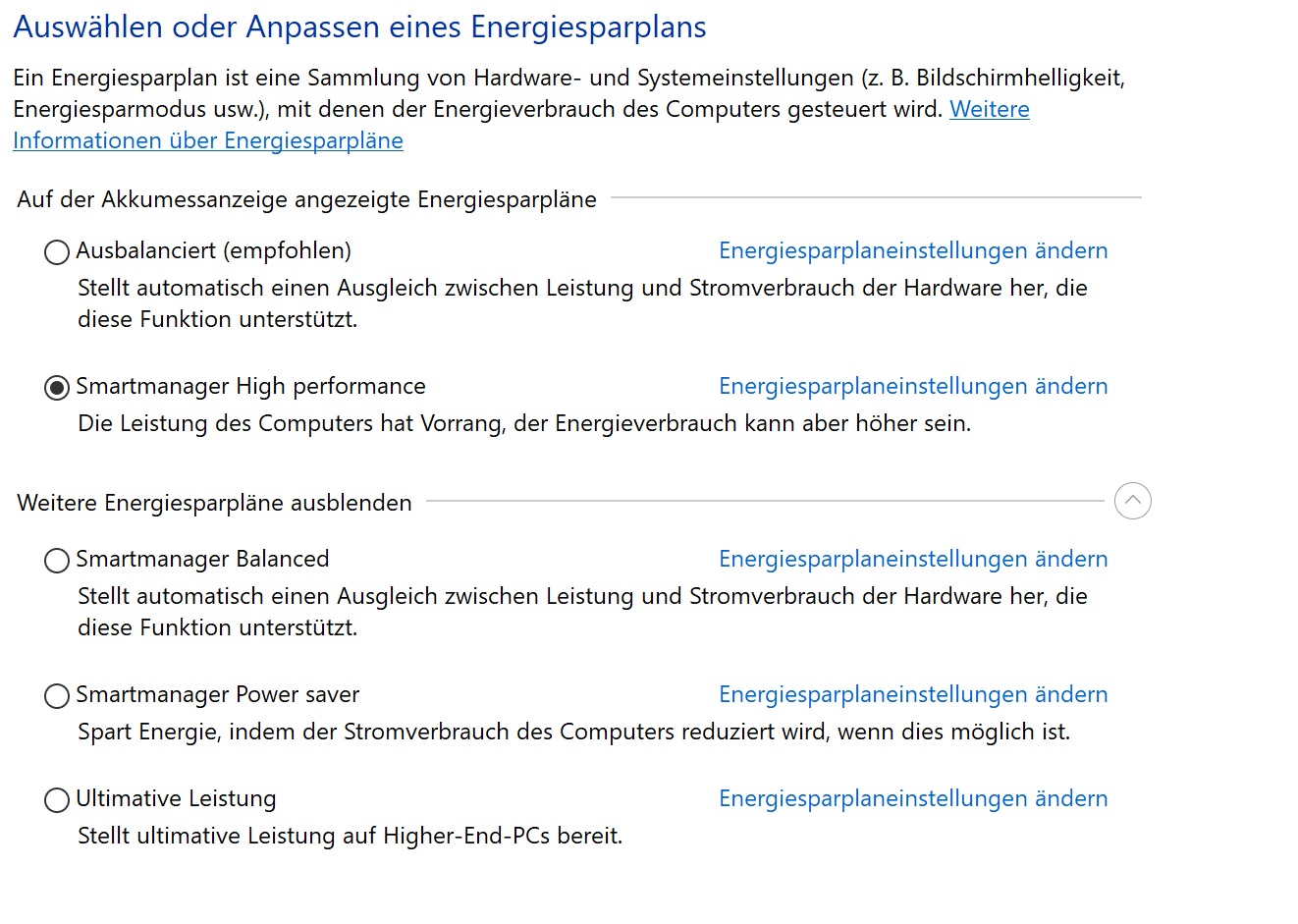 Ich habe ein Gigabyte Aero 15xV8 (Notebook) und nutze den vorinstallierten "Smart-Manager" von Gigabyte, um relativ schnell und unkompliziert meine .ICC Profile für die Farbverwaltung zu laden. Leider hat der "Smart-Manager" von Gigabyte eigene Energiesparpläne, die bei jedem Neustart automatisch wieder da sind, auch wenn ich diese vorher über die CMD/Powershell lösche. Leider wird nach jedem Neustart auch automatisch ein Energiesparplan vom Smart Manager geladen - und nicht wie von mir gewünscht Ultimative Leistung.