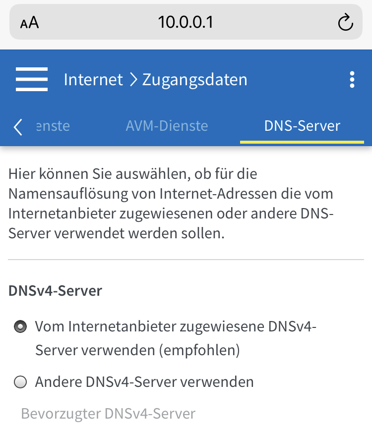 - Fritzbox Einstellungen prüfen/posten welche DNS-Server für IPv4 und IPv6 verwendet werden