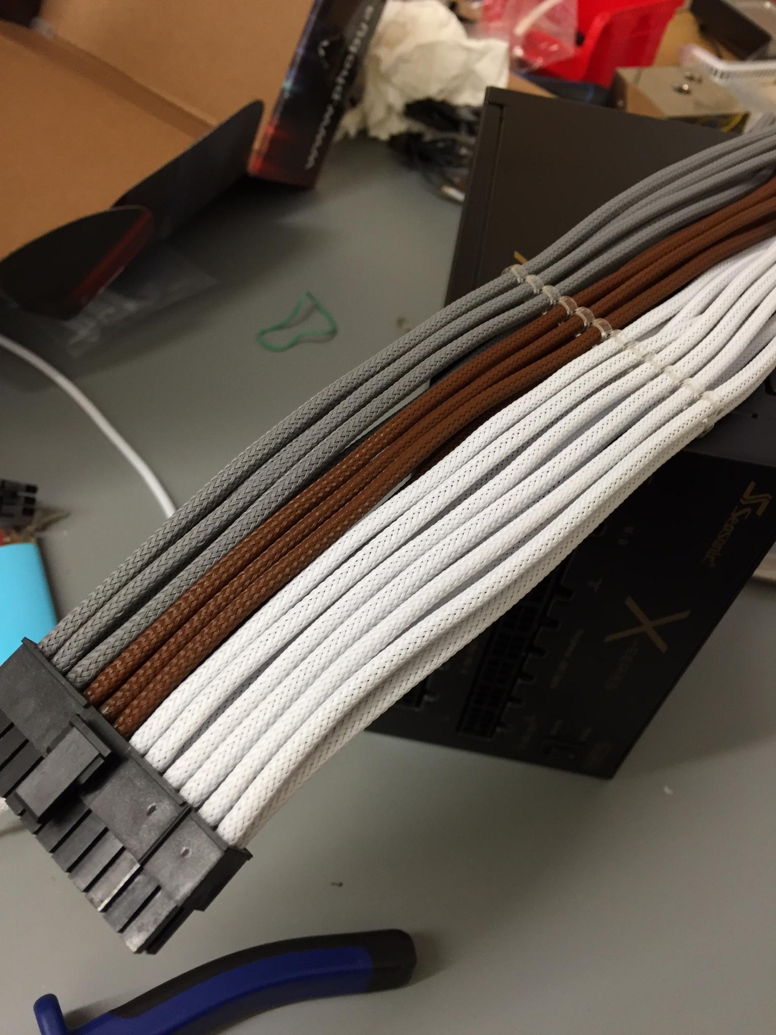 Als nächstes ging es ans Kabel sleeven. Nach einigen YouTube-Guides und ein paar Probesleeves an einem alten Kabel machte ich mich an das Seasonic-Netzteil. Hier musste ich feststellen, dass das Layout der Adern bei diesem Netzteil nicht besonders „Sleevefreundlich“ ausfällt. Viele doppelte Adern, der 24pin-ATX-Stecker endet in 2 Steckern auf Netzteil-Seite, etc. Letztendlich war das ganze aber relativ problemlos, mit Musik nebenbei kommt man nach ein paar Adern in den „Groove“. Die doppelten Adern habe ich nicht getrennt und als Y-Kabel neu verlötet, wie es die ordentlichste Variante wäre. Ich habe den Sleeve einfach über beide Adern geschoben. An einigen Stellen sieht man, dass diese Doppeladern etwas klobiger sind, da sowieso nicht allzuviel von den Kabeln zu sehen sein würde, habe ich mir diese Mühe aber erspart. Und das Ergebnis kann sich trotzdem noch sehen lassen.