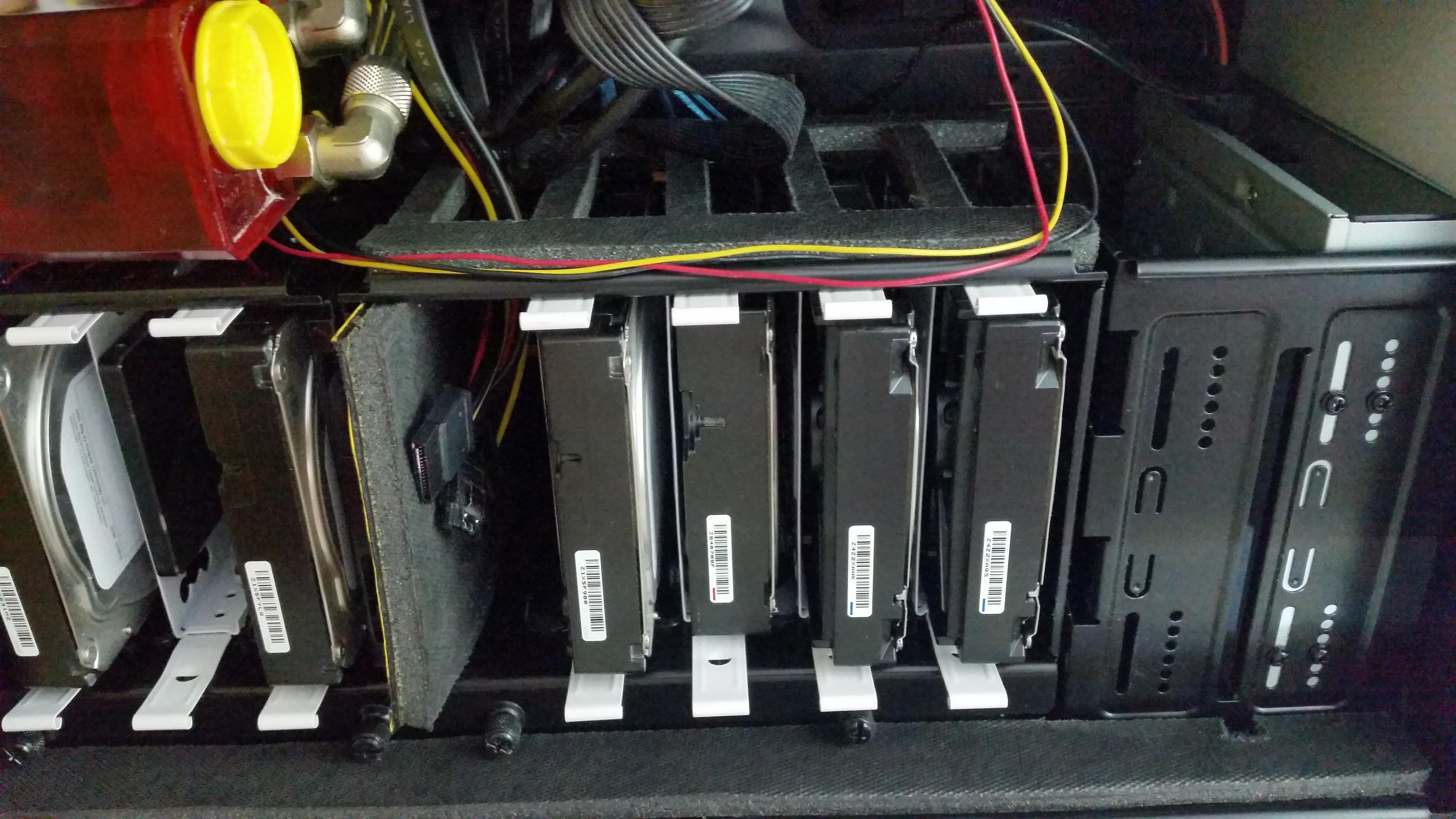 Das Problem ist nun, dass es kaum Gehäuse zu geben scheint, die mir genug Platz für die 3 Festplatten bieten, da diese ja in dem 5.25" großen Vibe Fixern hängen. Stattdessen haben sich mehr oder weniger Festplattenkäfige durchgesetzt - allerdings zweifle ich daran, ob die auch nur annähernd so effektiv die Vibrationen auffangen wie eben diese Vibe Fixer.