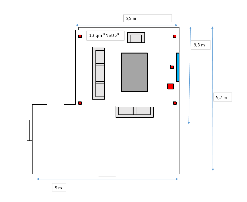 Aufstellen würde ich die Boxen auf etwa 13 qm, wobei der eigendliche Raum etwas Größer ist.