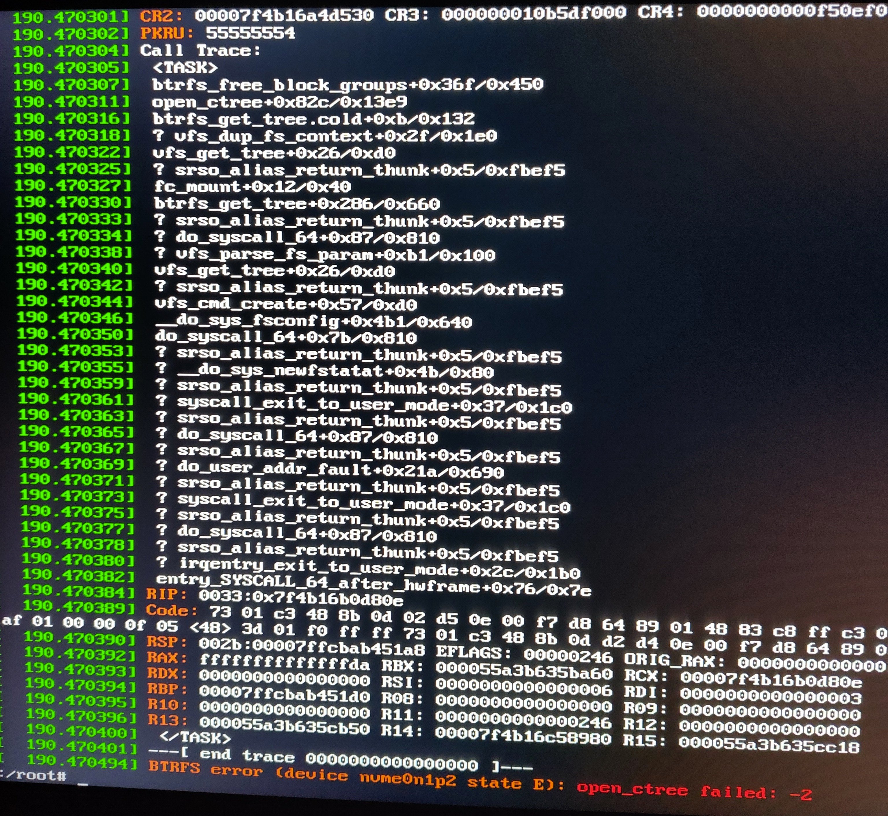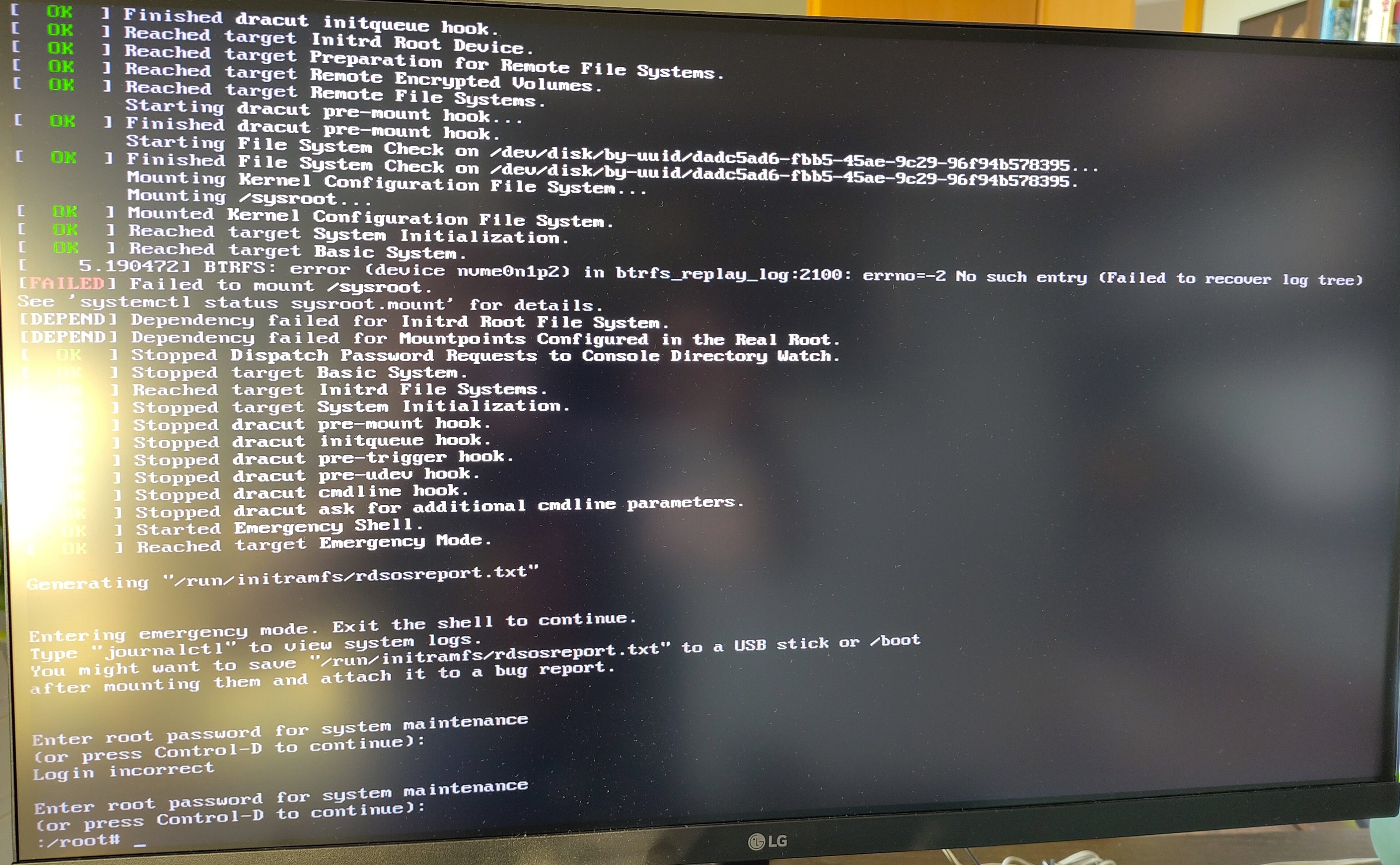 Dann kam beim Booten der Fehler unten. Failed to mount /sysroot.