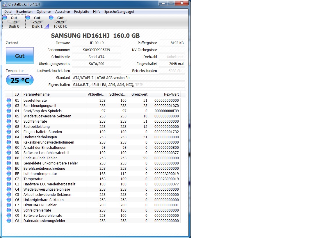 Anschließend habe ich die beiden Platten wieder ans Mainboard gehängt und versucht mit Chrystaldiskinfo die benötigten Screenshots zu erstellen, dabei ist mir aufgefallen, dass nur eine Samsung angezeigt wird?!