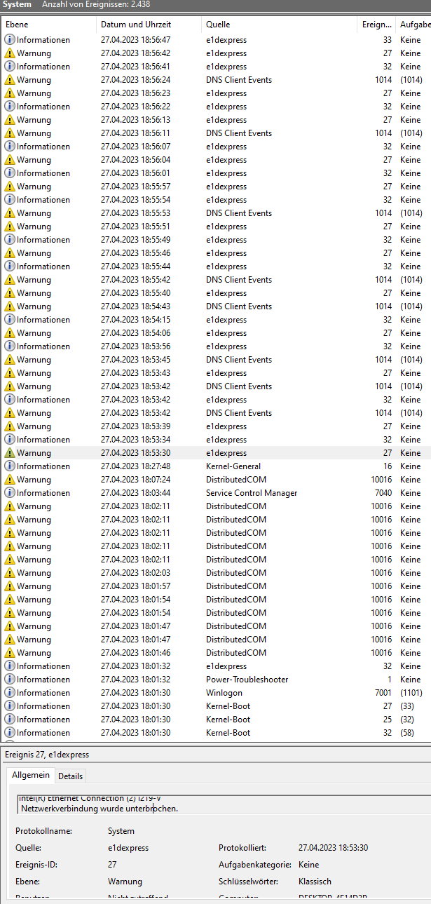 Jetzt ist es 17:30 und ich habe seither kein Ereignis mehr im Ereignislog und kein Disconnect mehr.