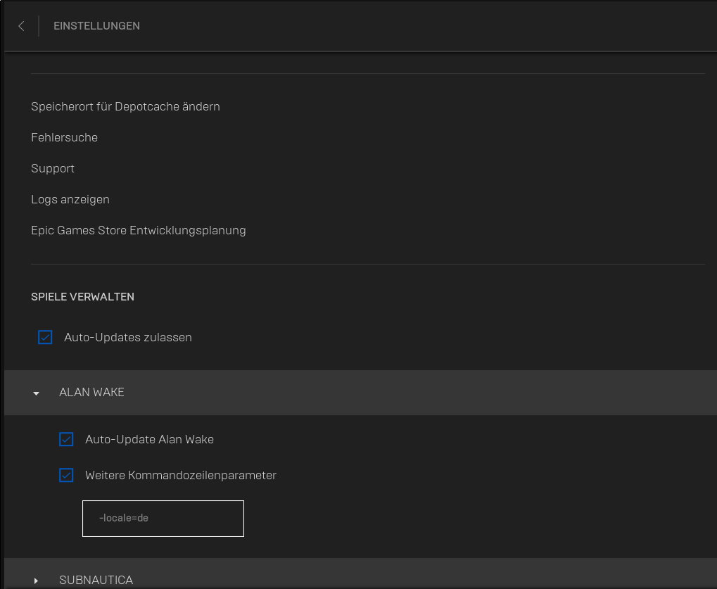 Ihr müsst den Epic Launcher aufrufen, dann auf Einstellungen gehen und dort Alan Wake wählen. Dann wie auf dem Screenshot zu sehen, bei weitere Kommandozeilenparameter einen Haken rein und folgendes in der neuen Zeile eintragen für deutsch => -locale=de