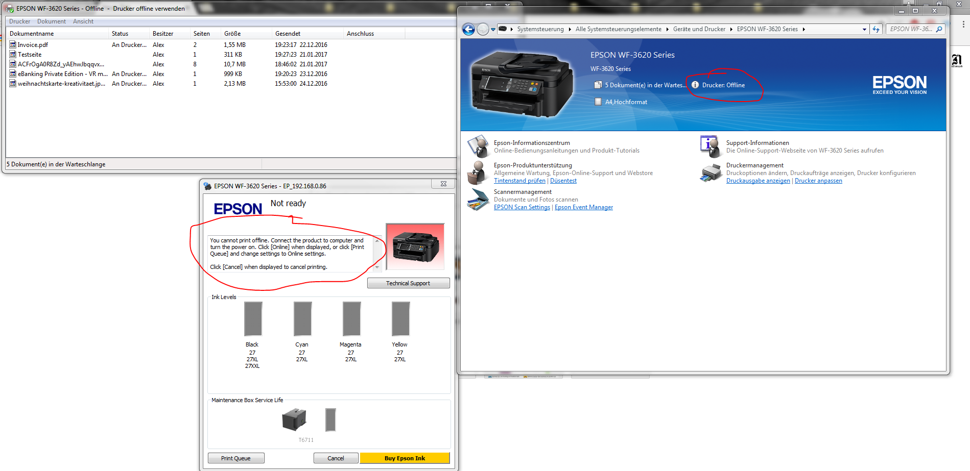Der Drucker ist mit den Router verbunden und mein PC übers W-LAN. Somit habe ich immer über W-LAN gedruckt. Seit kurzem jedoch ist dies nicht mehr möglich. Wenn ich etwas Drucken will kommt es unten nicht an, es steht aber noch in den Druckaufträgen. Im EPSON-Protal wird der Drucker auch als Offline angezeigt obwohl dies nicht stimmt.