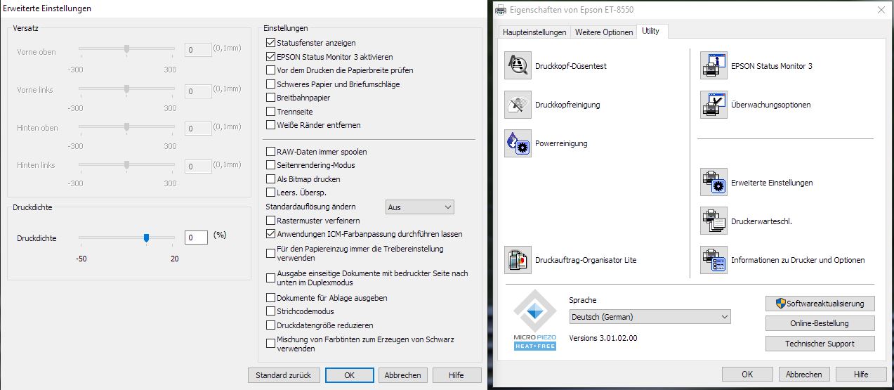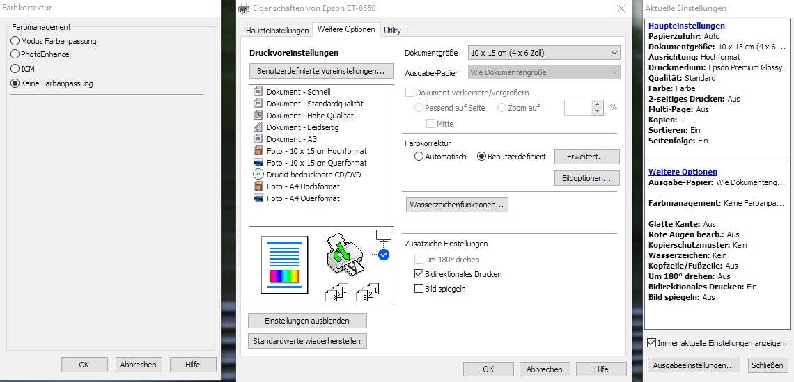 habe kürzlich einen Epson ET-8500 beschafft, primärer Einsatzzweck Foto/Stickerdruck und bin nicht gänzlich zufrieden, da Bildausgabe über Macbook/Papier sehr weit auseinander liegen. Macbook Monitor ist mit Displaycal/Spyder 5 kalibriert und Helligkeit liegt bei 170cd/m2.