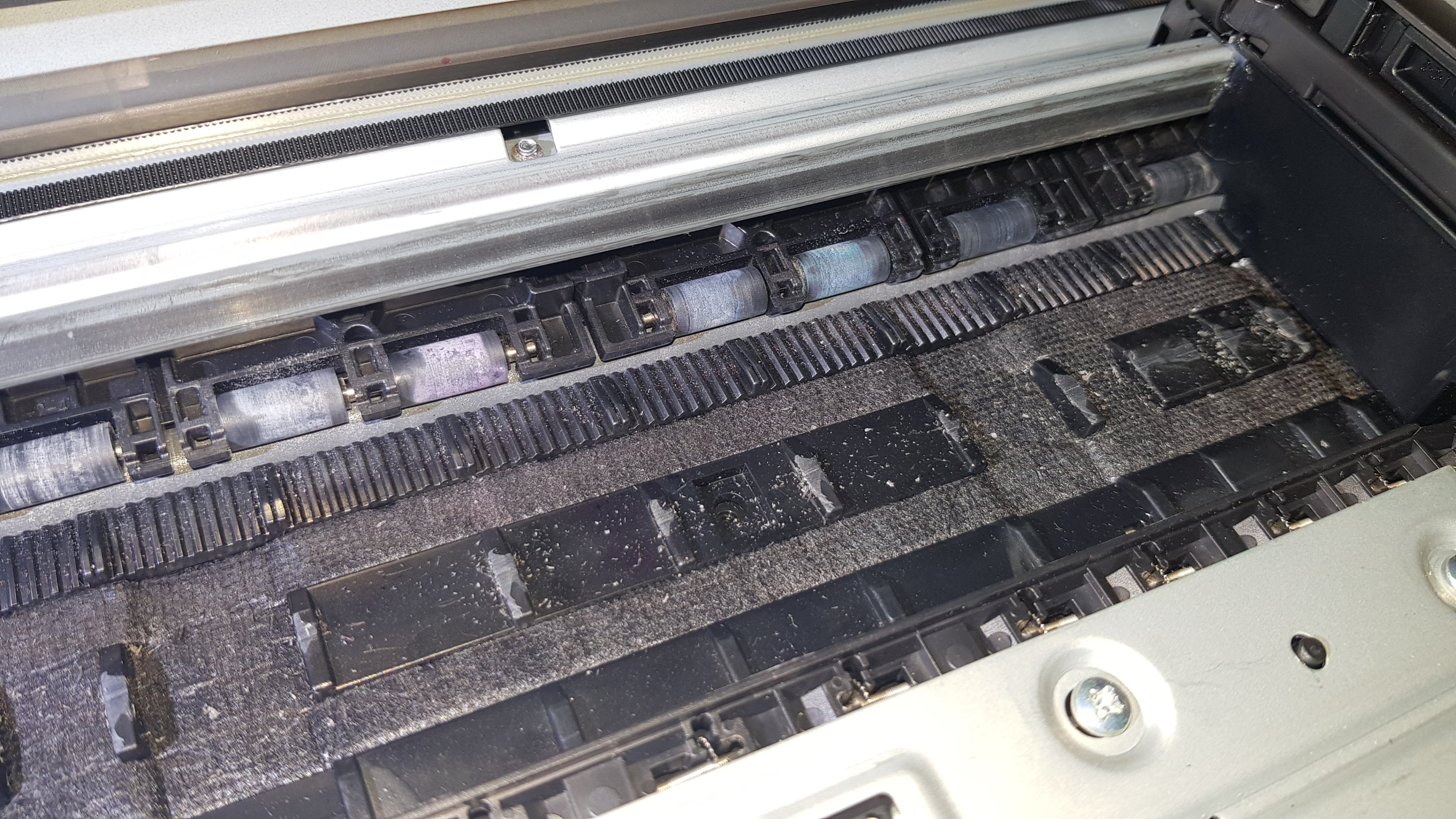 Er hat das Problem, dass die Unterseite des Druckkopfs beim Hin- und Herfahren auf einer Plastikschiene rattert. Ich wollte den Druckkopf neu ausrichten lassen, jedoch reißt er das Papier beim Bedrucken.
