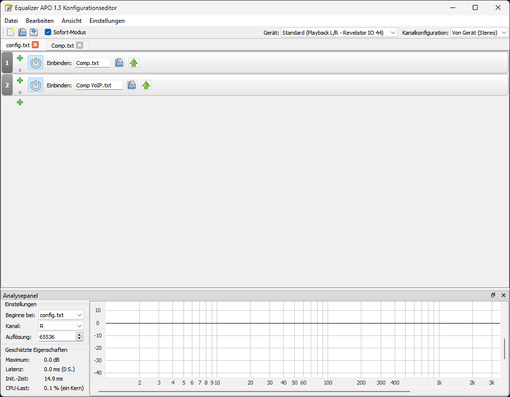 Vor 2 Tagen ging meine externe Soundkarte vom HyperX Cloud II kaputt und ich nutze seitdem die Onboard Soundkarte vom ASUS ROG STRIX Z790-F GAMING WIFI. Da mir beim Spielen von PUBG aktuell die Ohren wegfliegen wenn ich schieße und ich die Schritte erst höre wenn sie neben mir laufen hab ich versucht mich mit Equalizer APO vertraut zu machen, aber egal was ich tue das Output device verändert bzw. der preamp. gain Filter verändert den Klang gar nicht. Macht auch keinen Unterschied wenn ich SFX/MFX, LFX/GFX und SFX/EFX installiere für das Standardgerät, wenn ich APO auch für das Output A1 device, welches ich bei VB benutze installiere hat der EQ auch keinen Einfluss und ich kann den APO nur als LFX/GFX installieren.
