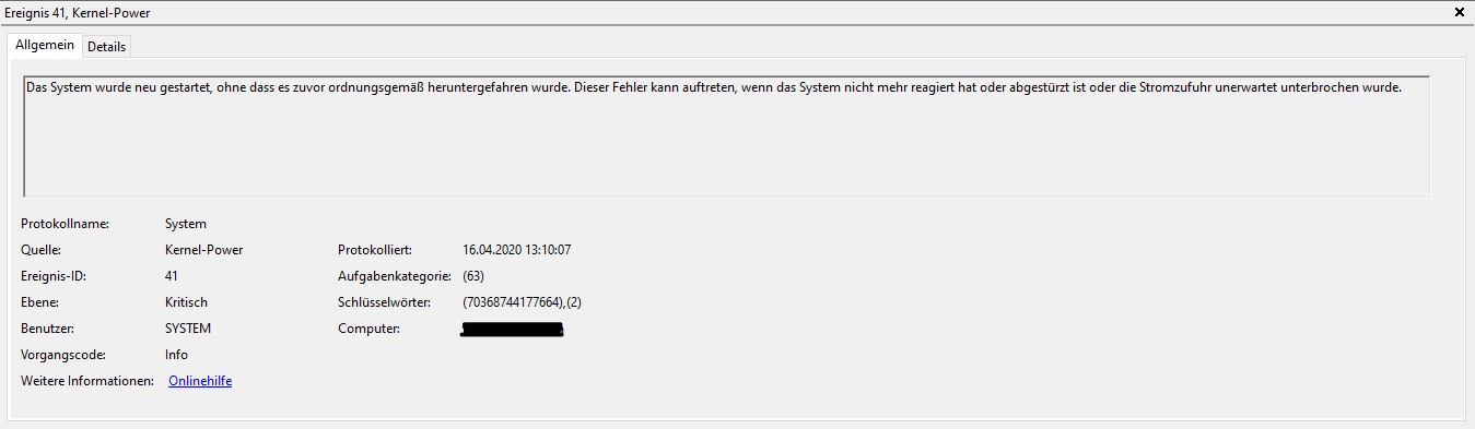 Mein PC fährt (meist während des Spielens) selbst herunter. Es hat vor drei Tagen angefangen, habe es gelöst indem ich Schnellstart in der Systemsteuerung ausgeschaltet habe. Das hat bis gestern Abend funktioniert. Jetzt tritt das Problem wieder auf. Im Anhang sieht man wie der Fehler im der Ereignisanzeige aussieht.