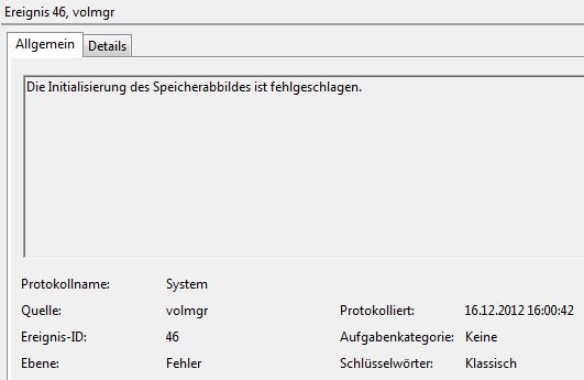 Es wurde kein Speicherplatz für den Crashdump (Absturz Abbild) eingerichtet bzw. kein Virtueller Speicher eingerichtet.