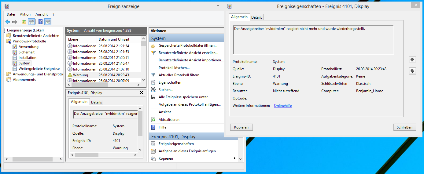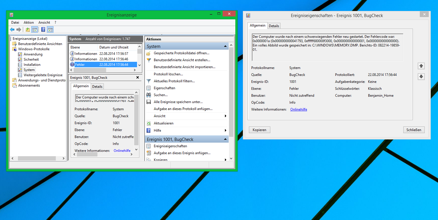 In der Ereignisanzeige unter Windows-Protokolle im Abschnitt System habe ich jetzt was gefunden was vor 30min wieder zu einem Bluescreen geführt hat. Allerdings werde ich daraus nicht schlau.