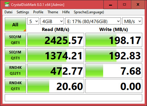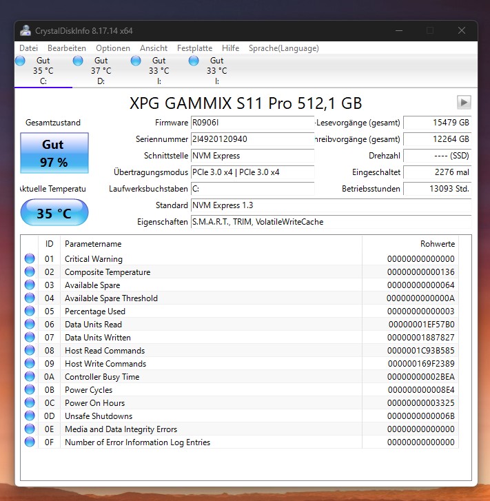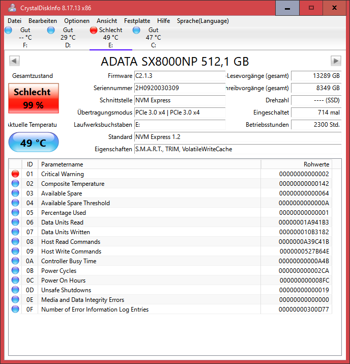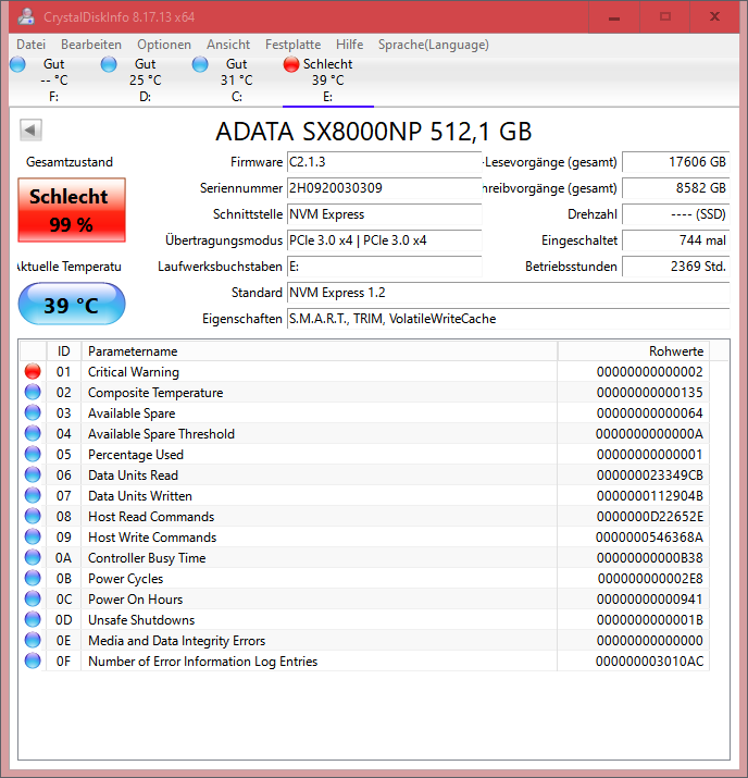 Habe eine ASX8000NP-512GM-C von ADATA, welche mittlerweile sehr niedrige Schreibraten aufweist. Dies habe ich festgestellt nachdem ich durch Zufall in Crstaldiskinfo den schlechten Zustand gesehen hatte.