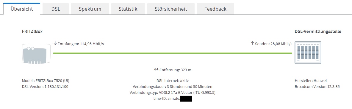 Anschluss wird, wie auch original 1&1-AnschlĂŒsse hier in der Gegend, ĂŒber WIA realisiert. Der BNG wurde noch nicht von Versatel fĂŒr L2-BSA erschlossen. Die Line-ID wird passend zum Drillisch-Markennamen dargestellt.